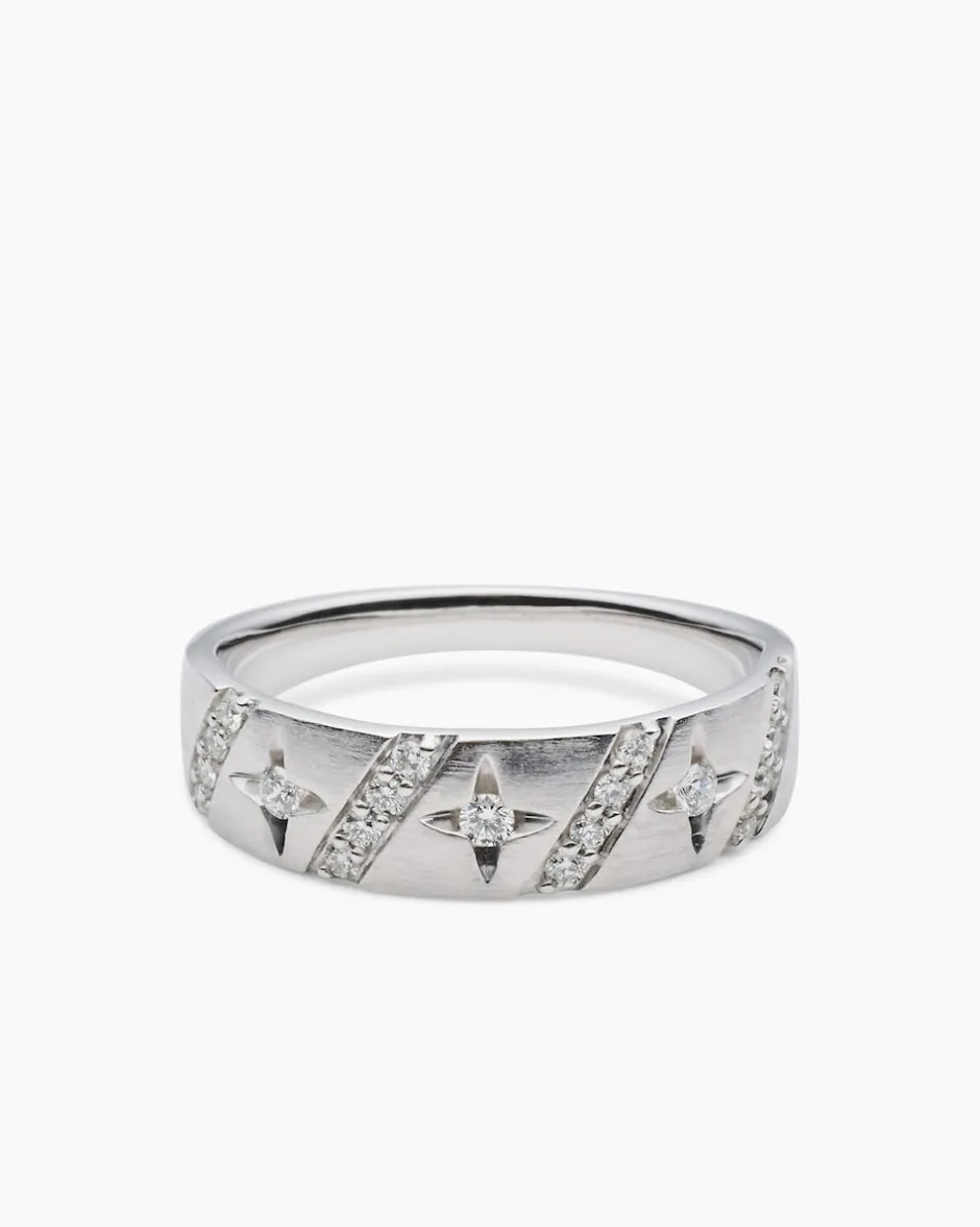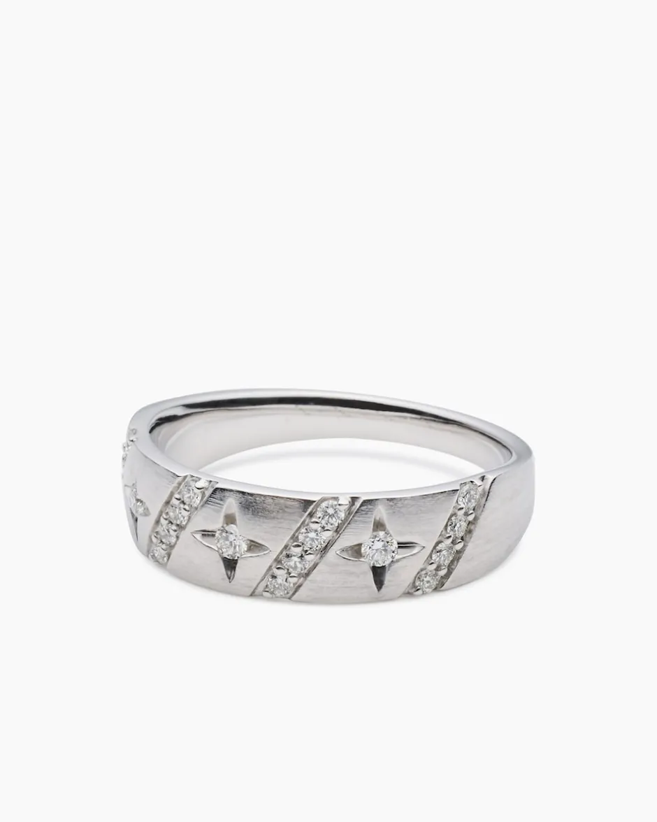 Sein extravagantes Design und der funkelnde Besatz aus 19 lupenreinen Brillanten machen aus diesem Platinring ein ganz besonderes und außerordentlich wertvolles Kleinod. Die drei größeren Brillanten sitzen im Zentrum der drei sternförmigen Strukturen, während sich die 16 kleineren über die vier diagonal angesetzten Streifen verteilen. Alle Brillanten begeistern auch durch ihre gute Schliffqualität. Der Ring ist ein perfekter Begleiter zu Ihren stylisch-urbanen Looks – romantisch, elegant und sehr feminin.