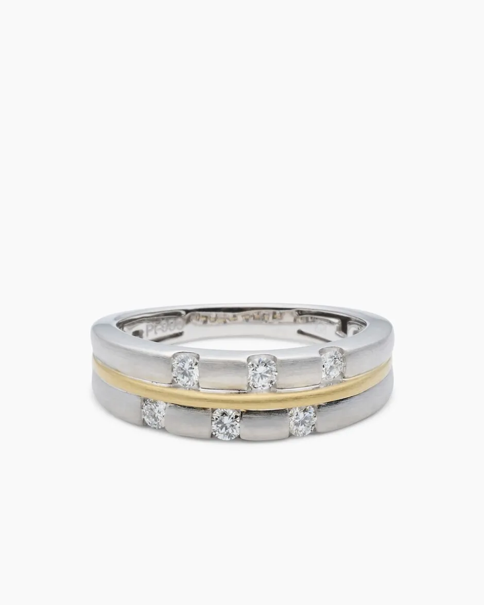 Der Ring mit modisch breiter Ringschiene ist aus kühlem, elegantem Platin 999. Mittig ist der Ring mit einem Streifen aus Gelbgold 750 verziert. Zusätzlich betört das Schmuckstück mit einem Besatz von sechs lupenreinen Brillanten in Weiß. Die Brillanten sind von sehr guter Schliffqualität und sitzen in wertvollen Kanalfassungen. Zudem sind sie im Brillantschliff veredelt und begleiten jede Ihrer Gesten mit einem spektakulärem Glitzern. Dieser Ring ist ein stilvolles Luxus-Accessoire in modernem Design – Ihr neuer Liebling in Ihrer Schmuckschatulle.