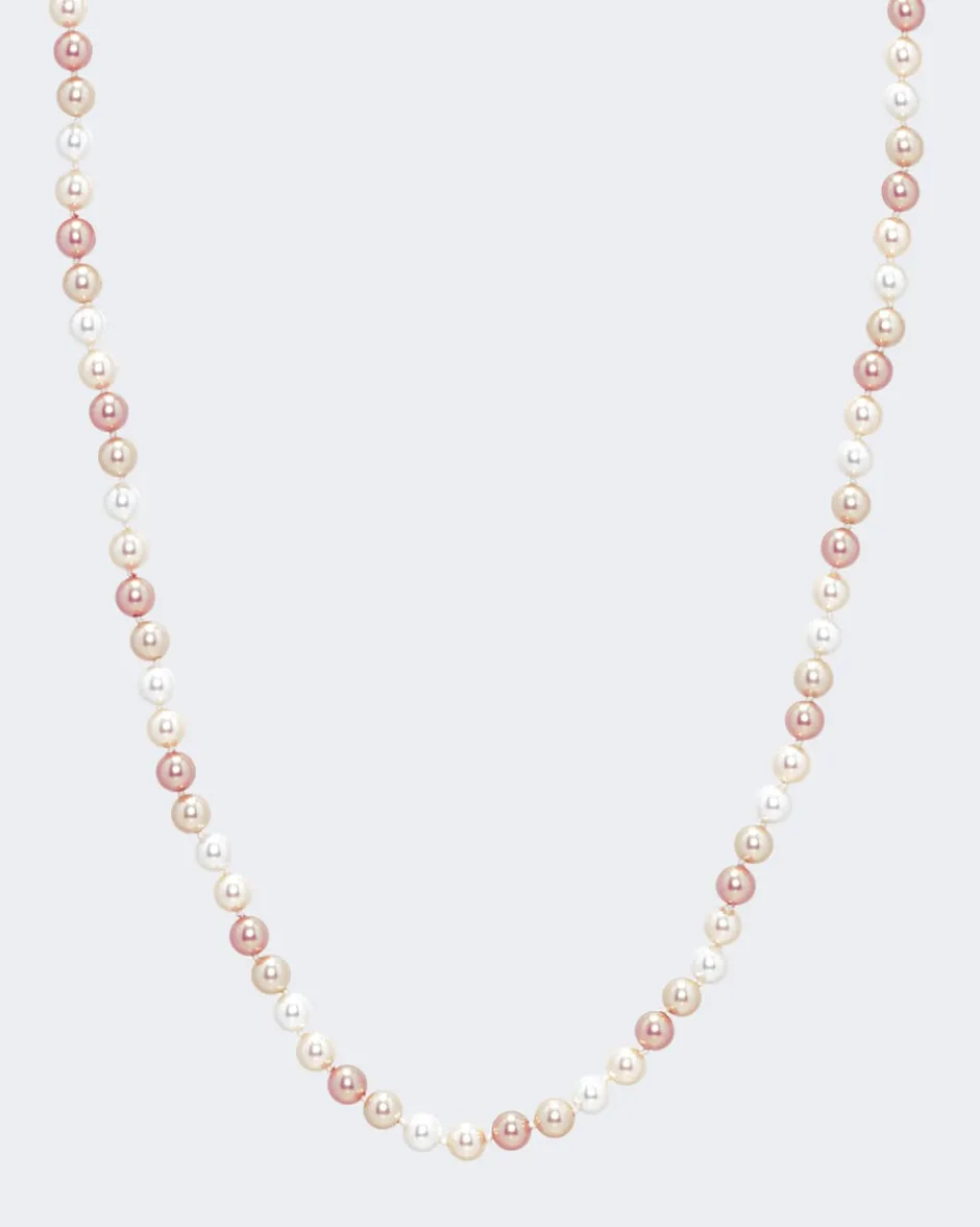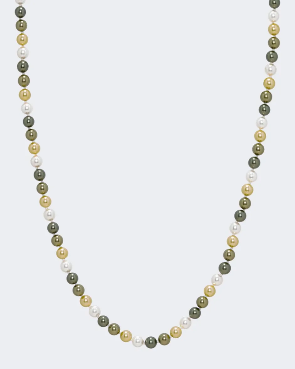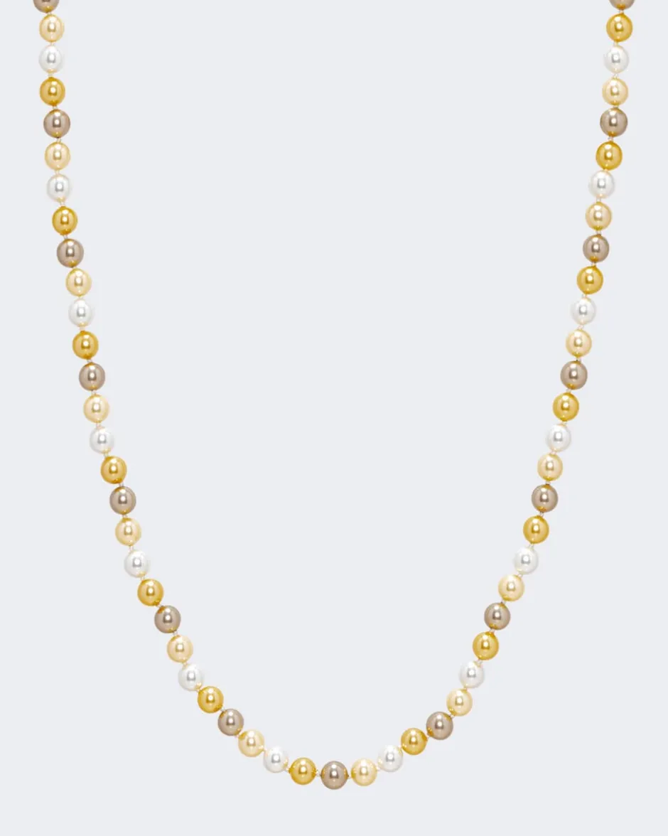 Das einzigartige Collier aus glänzenden Muschelkernperlen ist ein unwiderstehlicher Hingucker. Die ungewöhnliche Länge von 120 cm erlaubt die unterschiedlichsten Trageoptionen.