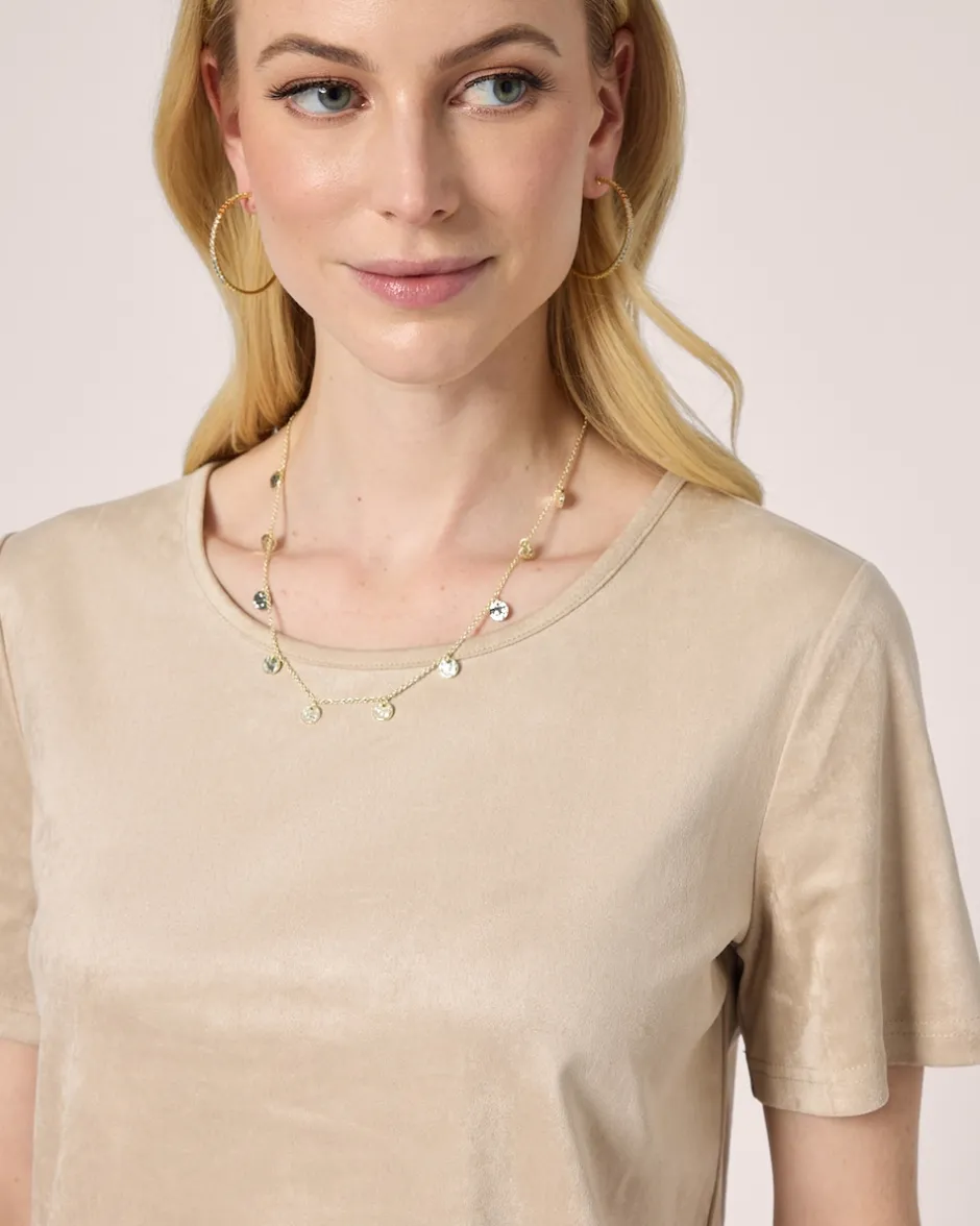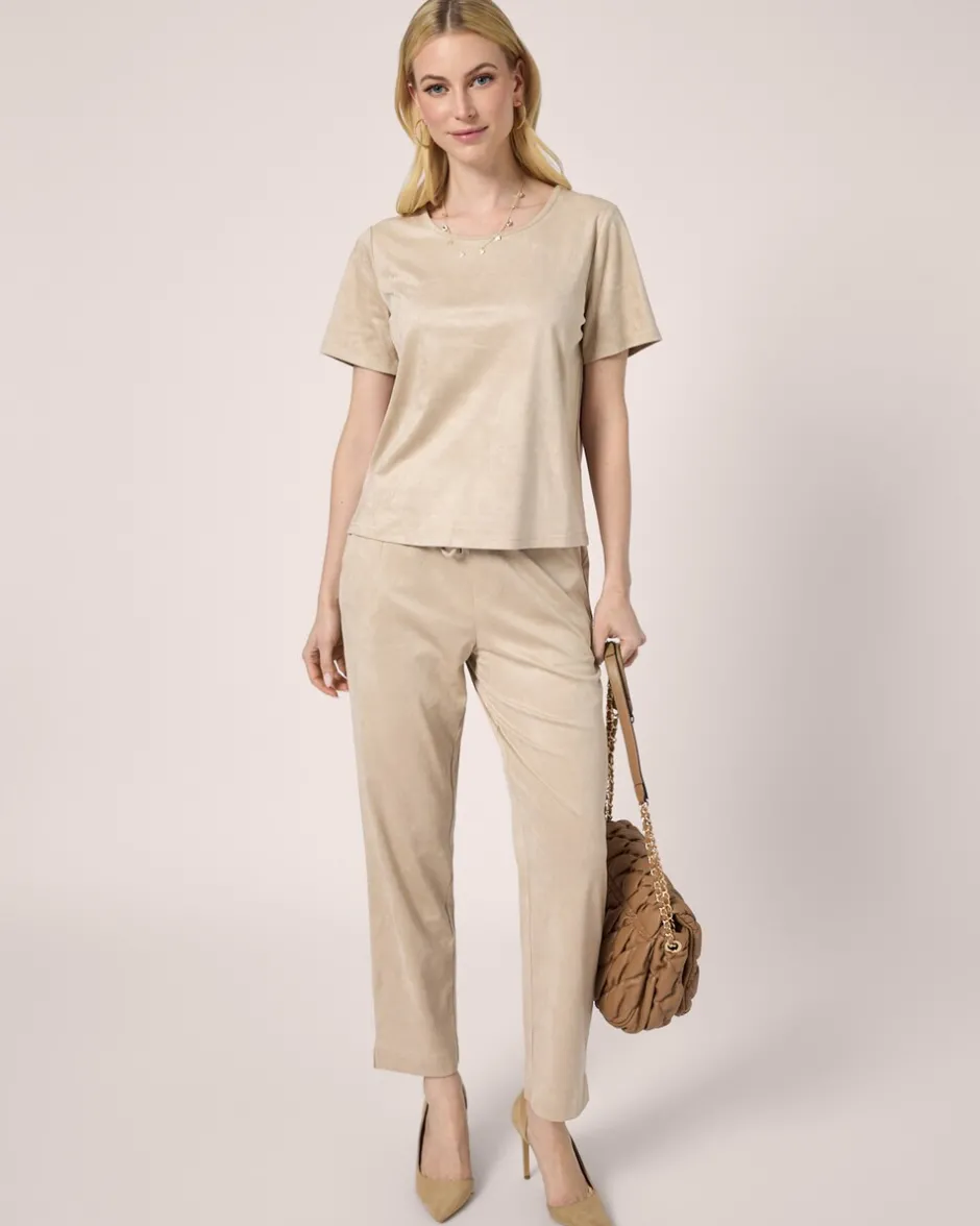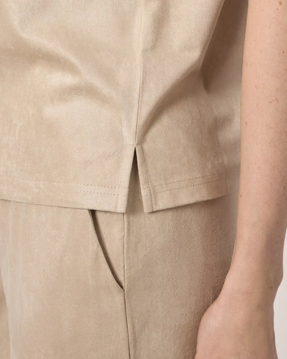 Erleben Sie eine exquisite Mischung aus Komfort und Stil mit unserem modischen Casual-Shirt aus edlem Faux Velours. Die wunderbar weiche Haptik schmeichelt Ihrer Haut, während die lässige Weite für eine entspannte Passform sorgt. In kombifreundlicher Unifarbe passt es zu jeder Garderobe. Der weite Rundhalsausschnitt unterstreicht elegant Ihren Halsbereich und der gerade Saum mit kleinen Seitenschlitzen ergänzt den lässigen Look. Ergänzen Sie jedes Outfit mit legerer Eleganz.