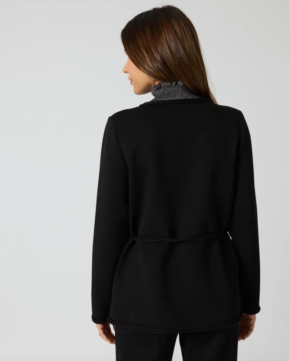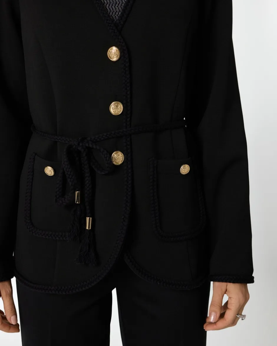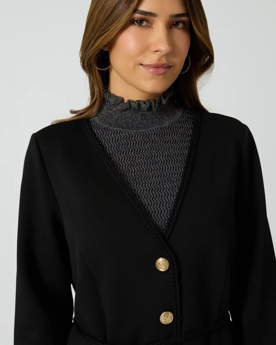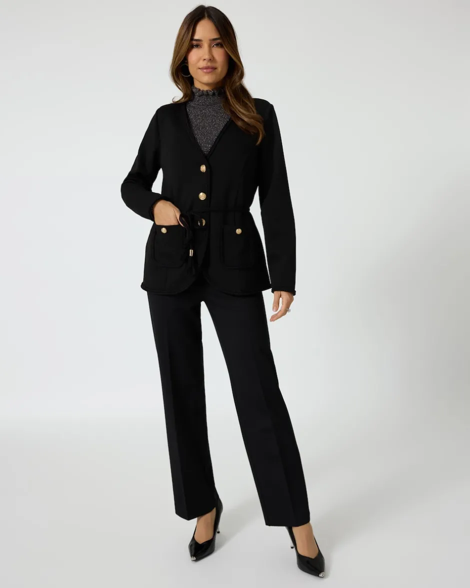 Diese classy „Couture Jacke von Judith Williams begeistert durch ihre lässige Eleganz. Einen besonderen Blickfang bilden die goldfarbenen, geprägten Knöpfe an Öffnung und Taschen. Aber auch die aufwendige Flechtumrandung und die charmante Kordel in der Taille bestimmen den stylishen Look. Als Ergebnis präsentiert sich eine blazer-artige Jacke, die auch mit eleganten Anlässen perfekt harmoniert.