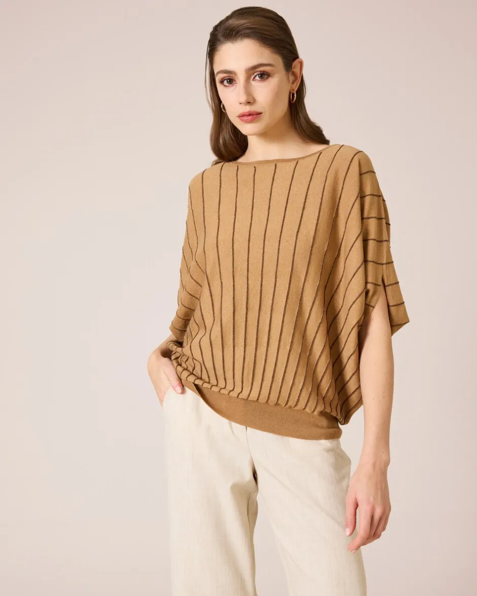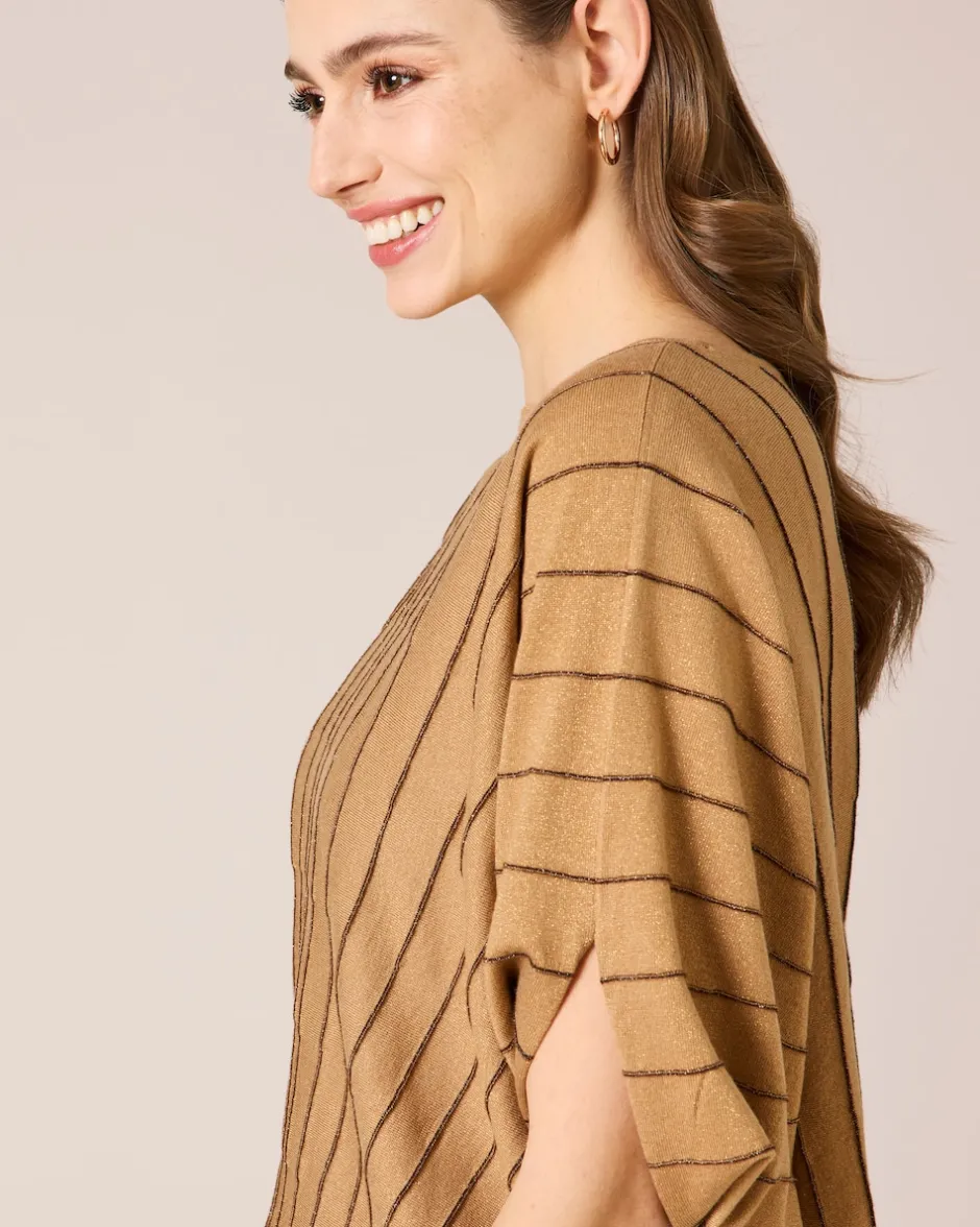 Wie frisch vom Laufsteg wirken Sie, wenn Sie diesen stylischen Pullover tragen. Sehr edel und gleichzeitig supermodern ist der Schnitt mit den weiten Fledermausärmeln und den glänzenden Längsstreifen. Das Bündchen am Saum sorgt dafür, dass der Rundhals-Pulli schick in Form bleibt. Die Strickqualität ist herrlich zu tragen und hat einen vorteilhaften Fall. Der Pulli umspielt zart Ihre Silhouette und setzt Sie elegant in Szene.