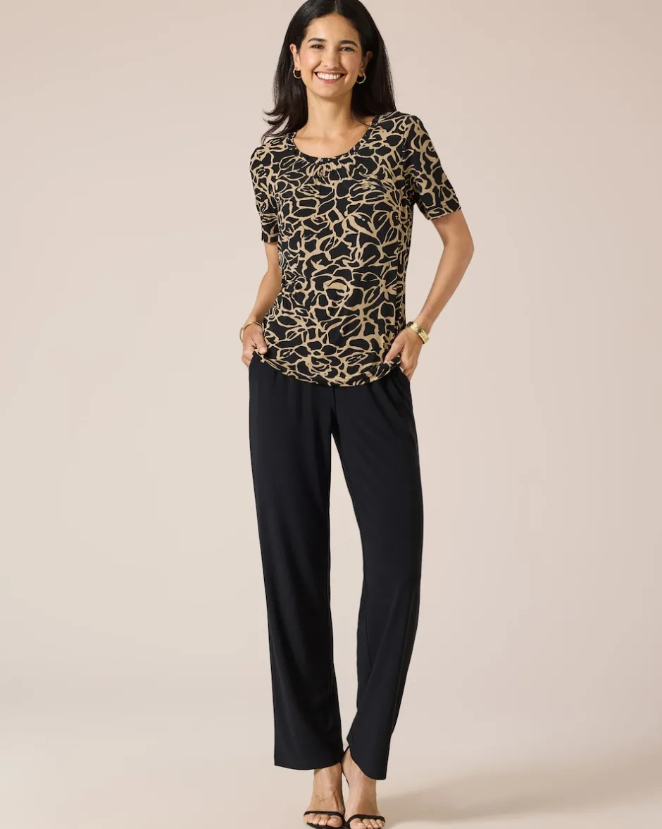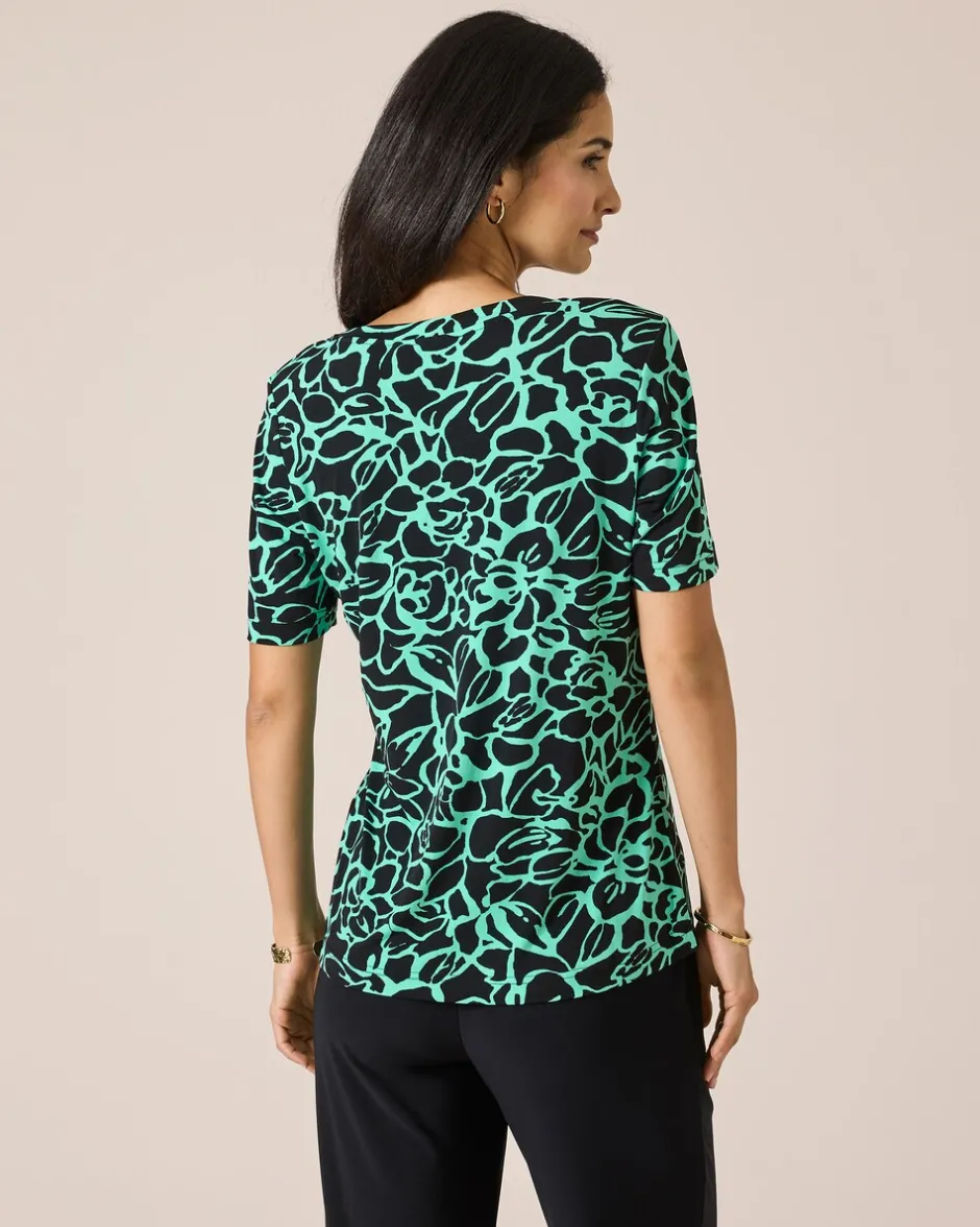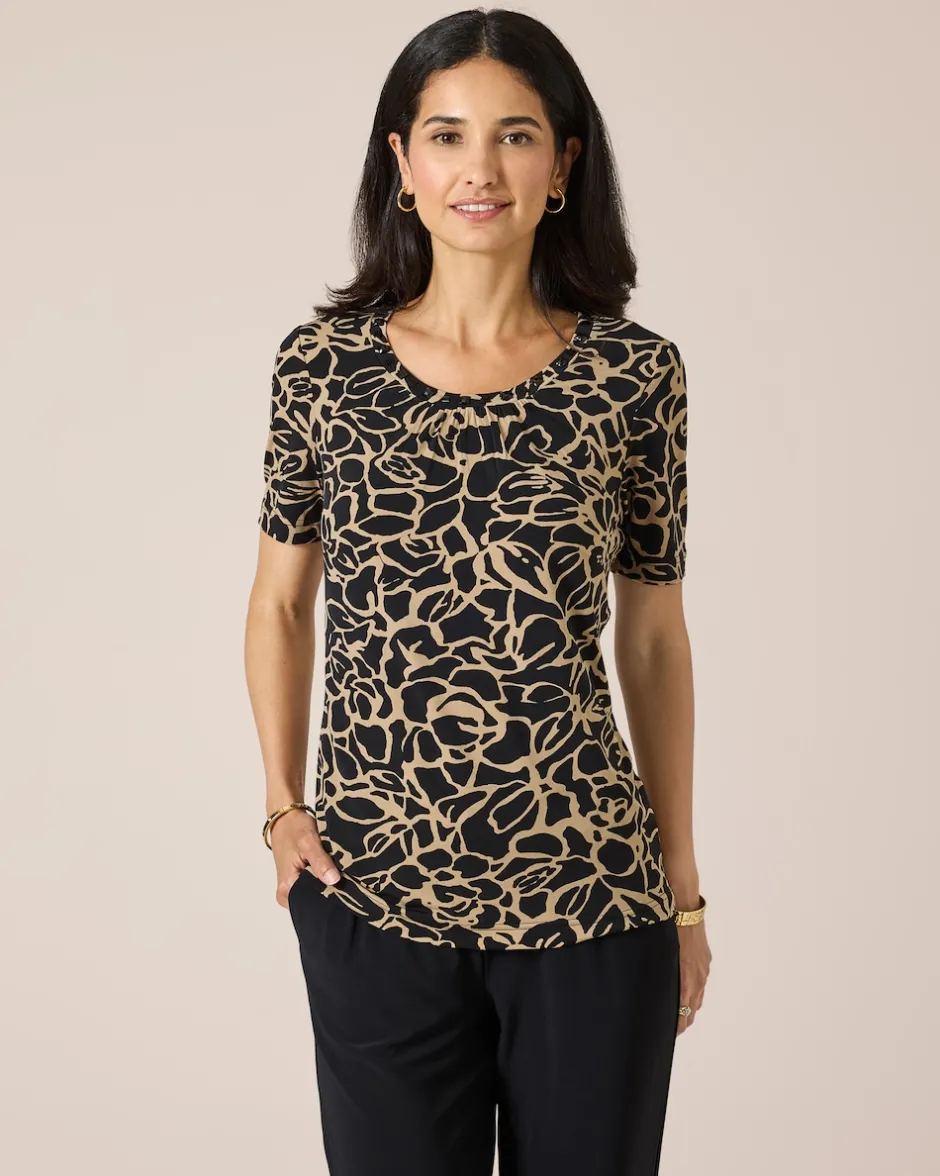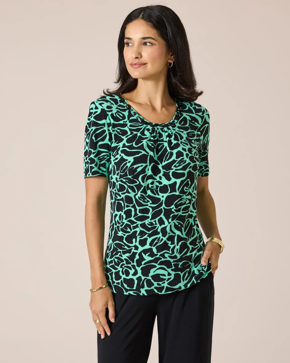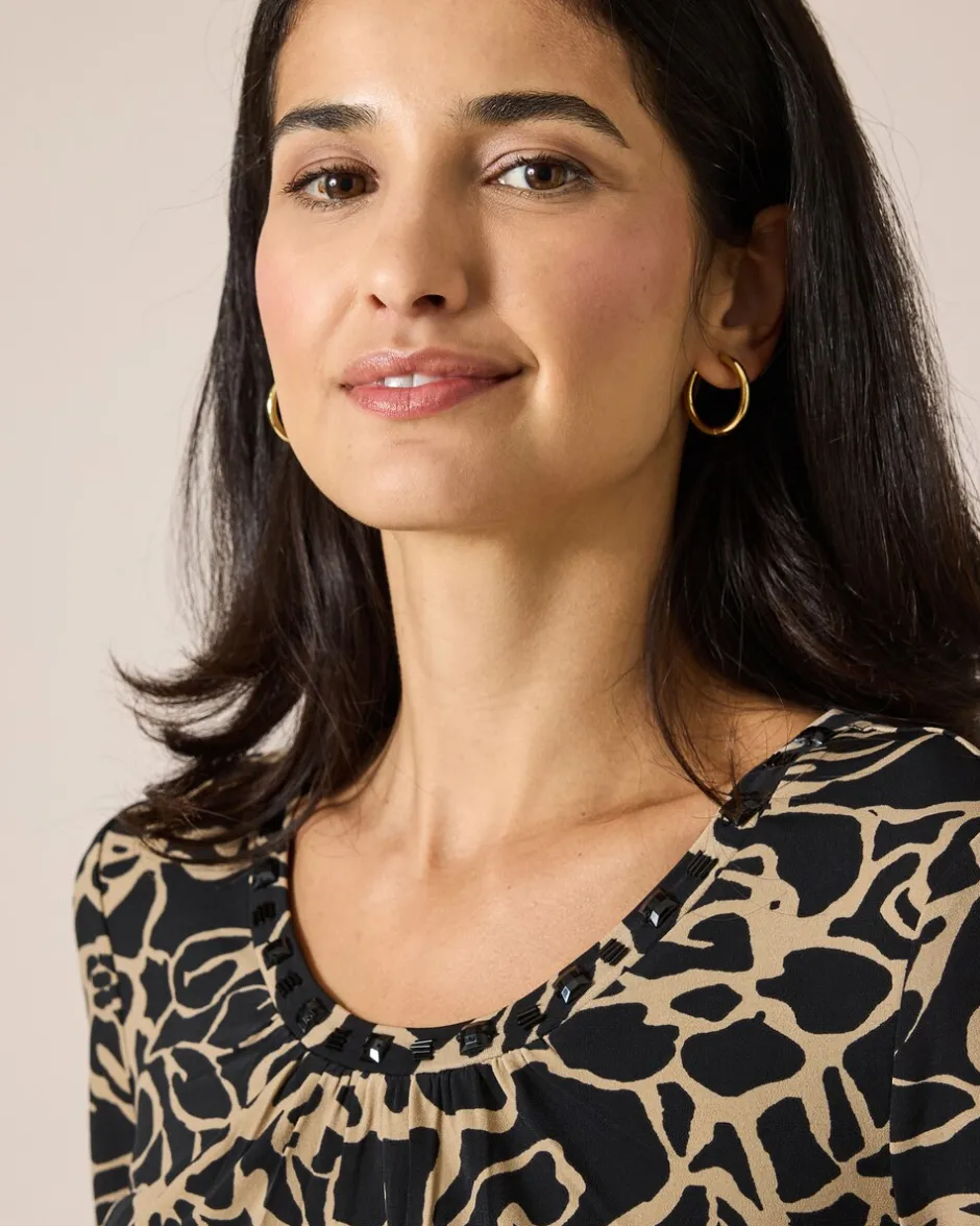 Durch die großzügige Länge und den figurnahen Schnitt zaubert das modische Shirt aus der Couture Line eine schöne, schlanke und feminine Silhouette. Dazu kommt der fantasievolle Allover-Druck, bestehend aus modernen, stilisierten Blütenmotiven in Bicolor-Optik. Zwei tolle Farbvarianten stehen zur Wahl. Zusätzlich ist das Shirt am Ausschnitt mit Dekodetails und schwarzen Ziersteinen gearbeitet.