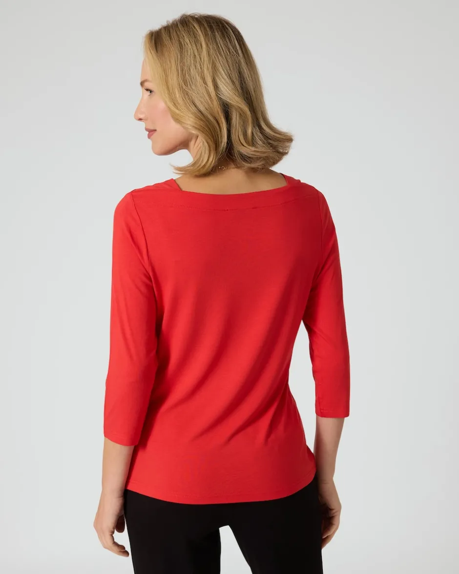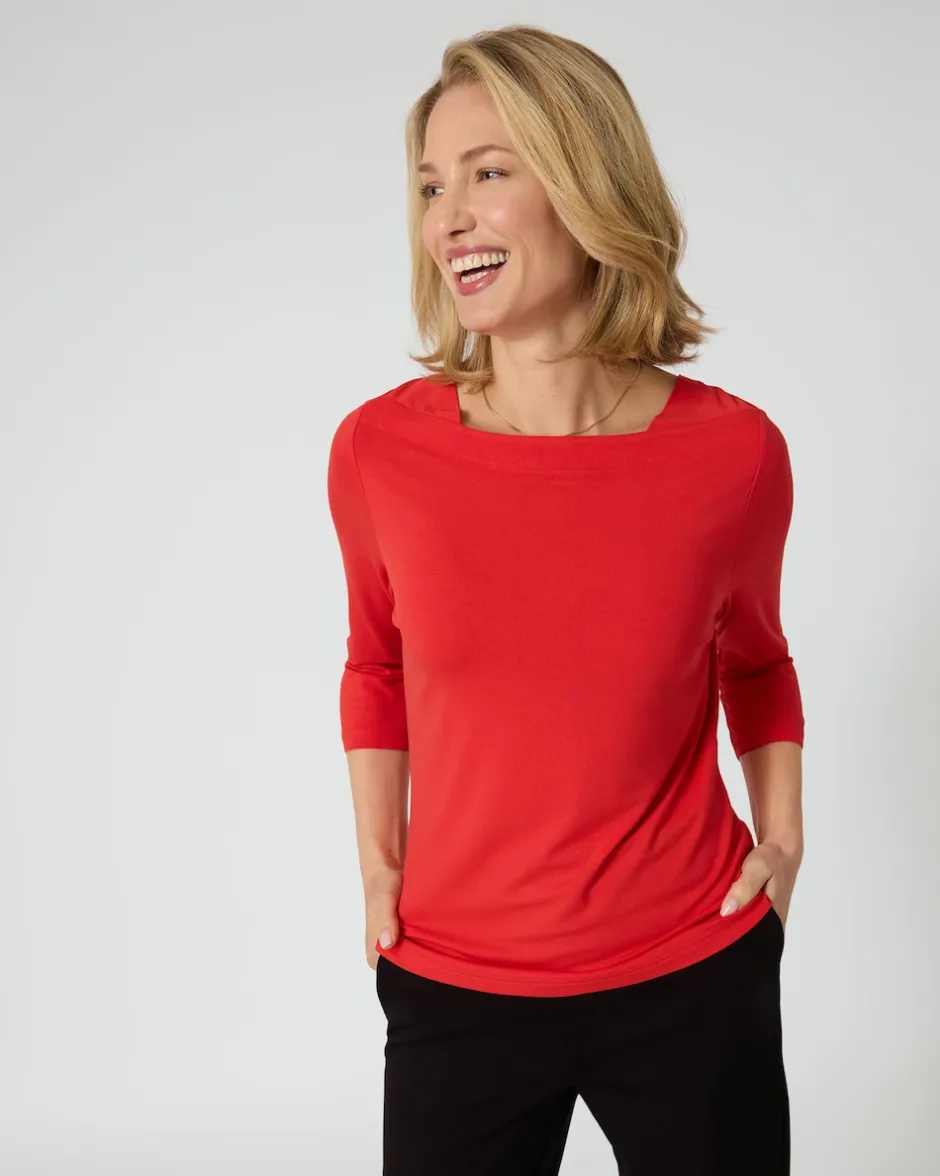 Unifarbene Shirts für schnelle Kombinationen dürfen in keinem Kleiderschrank fehlen. Mit diesem edlen Modell etwa zaubern Sie im Handumdrehen die unterschiedlichsten Outfits für Office, Freizeit und Party. Ausgestattet mit 3/4-Ärmeln und einem sehr eleganten U-Boot-Ausschnitt. Das Unidesign steht in fünf modischen Farben zur Wahl. Auch bester Tragekomfort ist garantiert, bedingt durch die erstklassige Materialqualität: Das Shirt ist aus Lenzing EcoVero™ Viskose gefertigt, einer nachhaltigen Faser, die gut für die Umwelt ist und so ein rundum gutes Gefühl vermittelt.