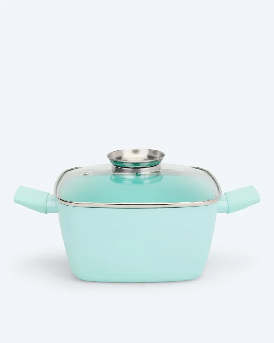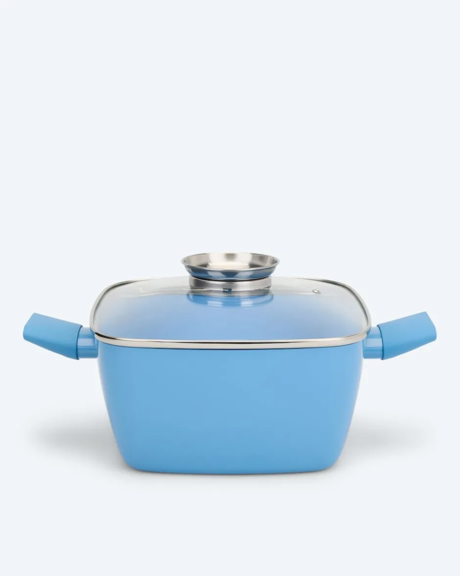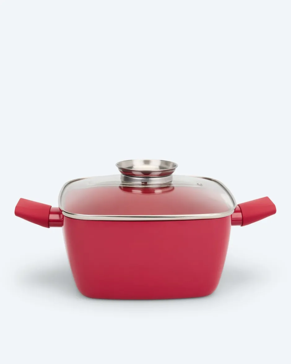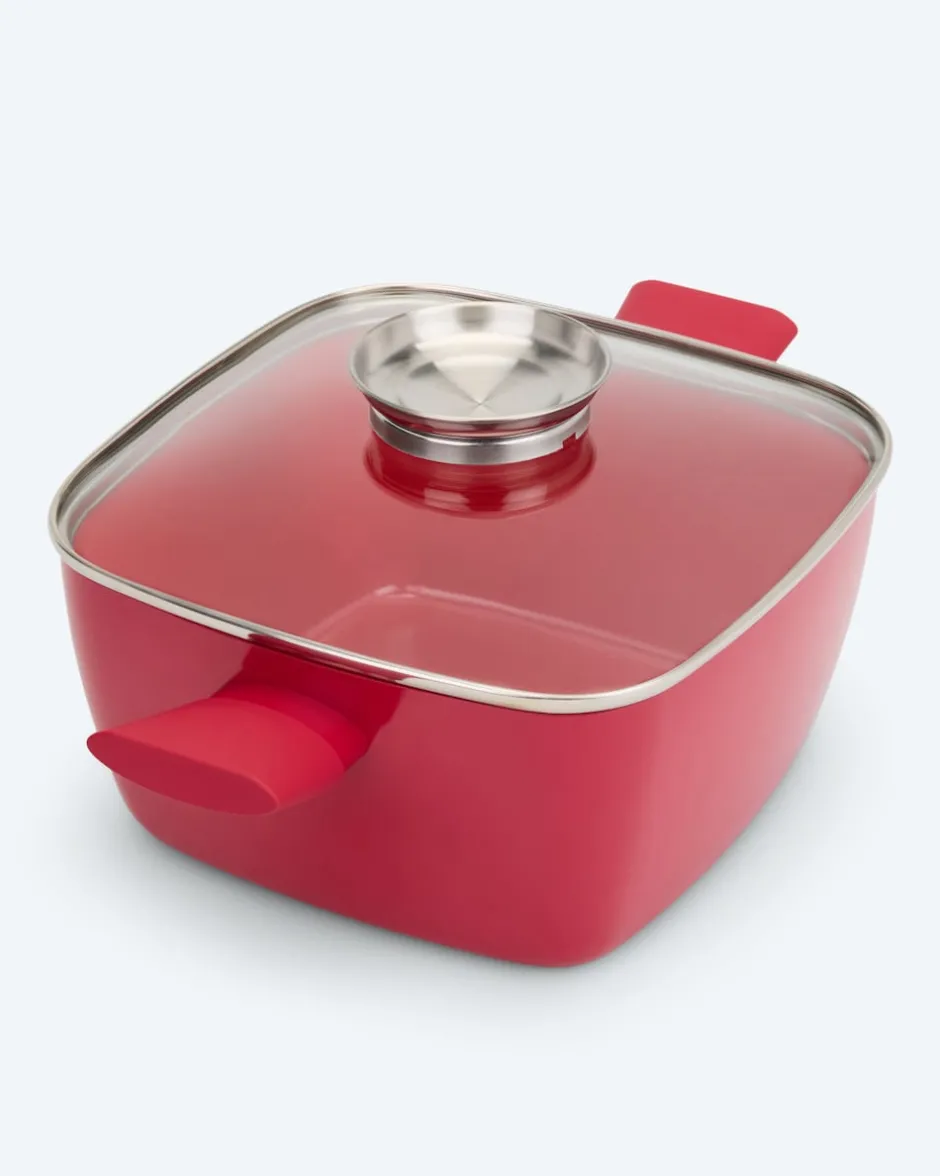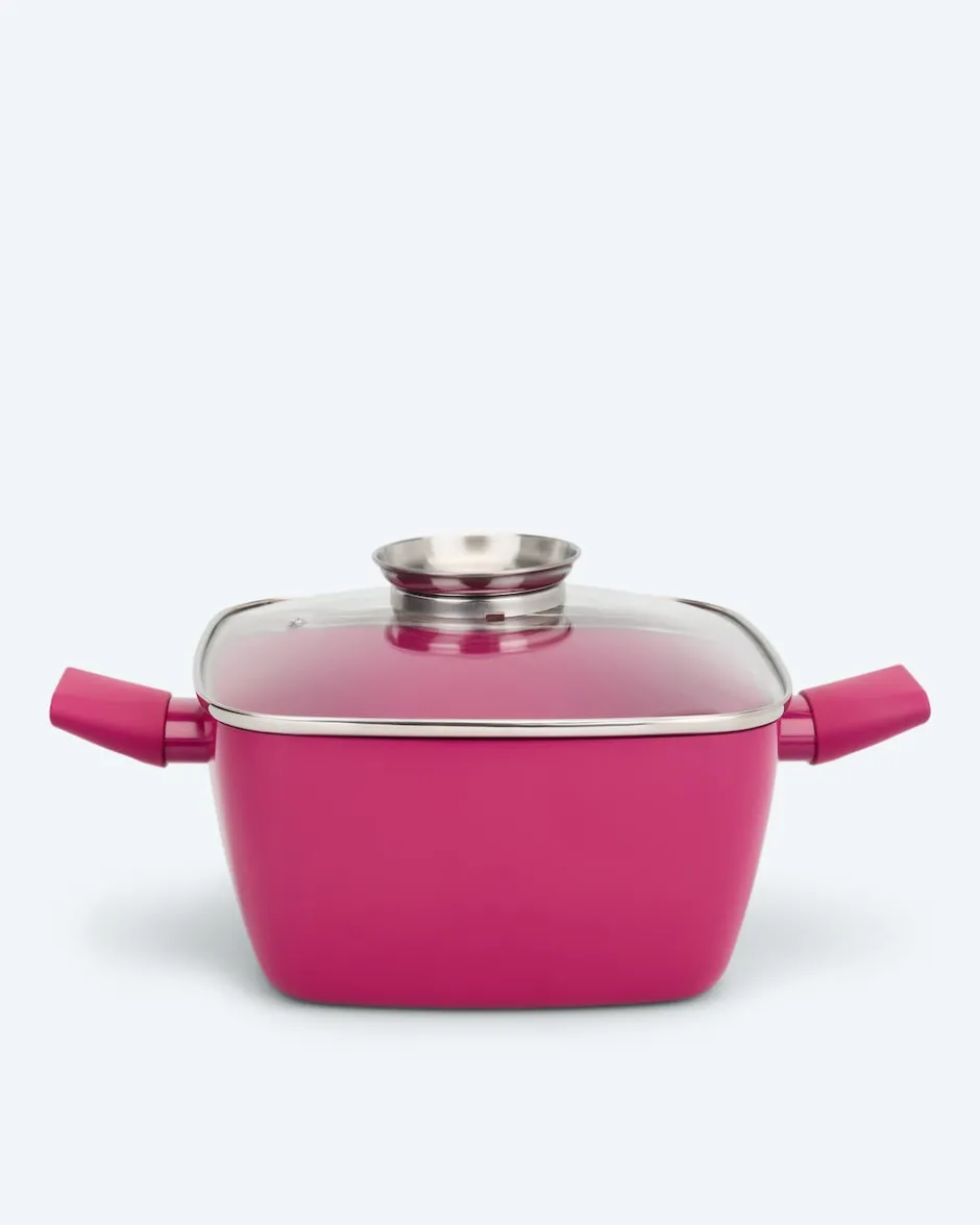 Hier kommt eine neuer Küchenprofi aus der Linie Cucinella für Sie. Die viereckige Universalpfanne mit Glas-Aromadeckel ist zum Braten, Schmoren und Garen geeignet. Der Deckel mit Einblick hat eine praktische Dampfablassfunktion. So haben Sie das Gargut immer im Blick. Sie können Ihre neue, farbig lackierte Pfanne auch auf Induktionsherden nutzen. Eine Keramikbeschichtung auf der Innenseite verhindert das Anhaften der Speisen.