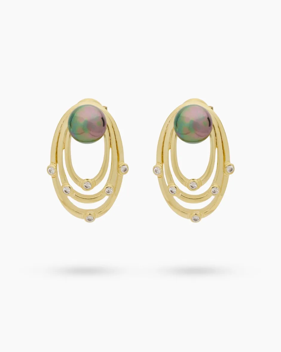 Bei den strahlenden Ohrringen handelt es sich um hochwertigen Schmuck mit Muschelkernperlen, die, wie Diamanten, mit einer speziellen Technik von Hand in Form geschliffen, in einem aufwendigen Spezialverfahren gefärbt und anschließend nachbehandelt werden. So sind eine erstklassige Farbe und ein wunderschöner Lüster garantiert. Die Ohrstecker stammen aus der Schmuckmanufaktur der Familie Pfeffinger in Pforzheim, in der bereits in dritter Generation außergewöhnliche Schmuckstücke gefertigt werden.