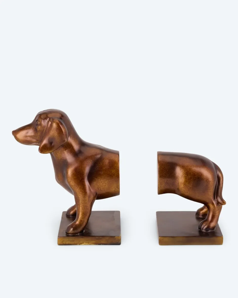 Wenn Sie außergewöhnliche Home-Accessoires lieben, dann wird Sie dieses edle Buchstützenpaar begeistern. Auch als originelle Geschenk-Idee kommt das stylische Duo garantiert gut an. Die Buchständer mit Dackelmotiv wirken absolut hochwertig und auch ein bisschen extravagant. Mit den massiven Stützen veredeln Sie Ihr Bücherregal, aber auch CDs, DVDs oder Schallplatten finden so stilvoll neuen Halt. Tipp: Ponyfreunde finden Buchstützen mit Pferdemotiv unter der Bestellnr. 477034.
