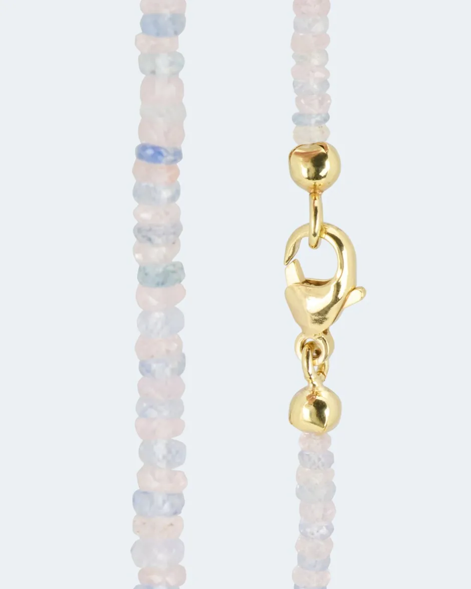 Zahllose Saphire in klassischer Rondelleform sind für dieses elegante Collier auf robusten Stahldraht gefädelt. Die Saphire in vielen unterschiedlichen Farben sind im Größenverlauf sortiert, so ergibt sich eine wunderbar harmonische Optik. Alle Saphire sind sorgfältig facettiert – dadurch entstehen unwiderstehliche Funkel-Reflexe, sobald etwas Licht auf Ihr Dekolleté fällt.