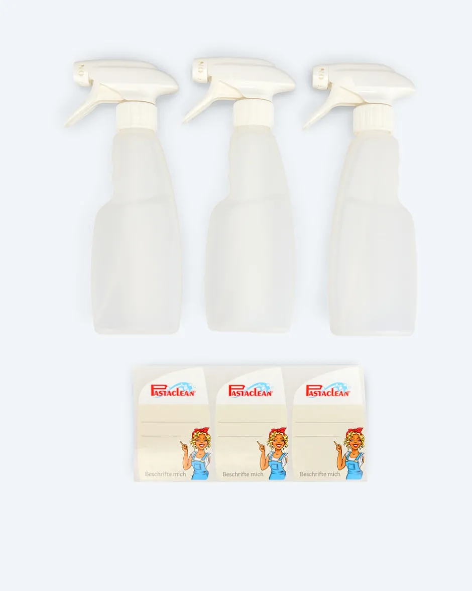 Für Ihr sauberes Zuhause erhalten Sie ein dreiteiliges Mischflaschen-Set von Pastaclean, in dem Sie Ihre Reinigungsmittel bequem anmischen und auftragen können. Die Flaschen aus Kunststoff verfügen über eine Füllmenge von je 250 ml und werden Ihnen mit praktischem Sprühkopf geliefert. Ein Stickerbogen dient der Beschriftung der Flaschen, damit Sie Ihre Reinigungsmischungen nicht verwechseln.