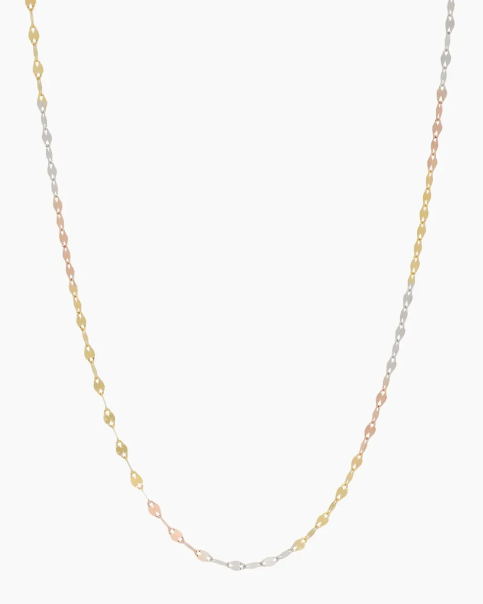 Die zarte Kette von ALEKS STERNEN Sternengold ist ein wunderschöner Blickfang. Aus 585er Gold gefertigt, funkelt sie dank ihrer raffinierten Machart bei jeder Ihrer Bewegungen – einfach unwiderstehlich. Sie haben die Wahl zwischen einem Modell aus Gelbgold und einem aus Gelb-, Rosé- und Weißgold. Bei dieser Variante sind die drei Goldfarben im Wechsel angeordnet und verstärken das charismatische Changieren, das die Kette ohnehin mitbringt. Schmücken Sie sich mit der charmanten Alleskönnerin, die solo oder in verschiedensten Kombinationen eine wahre Augenweide ist.
