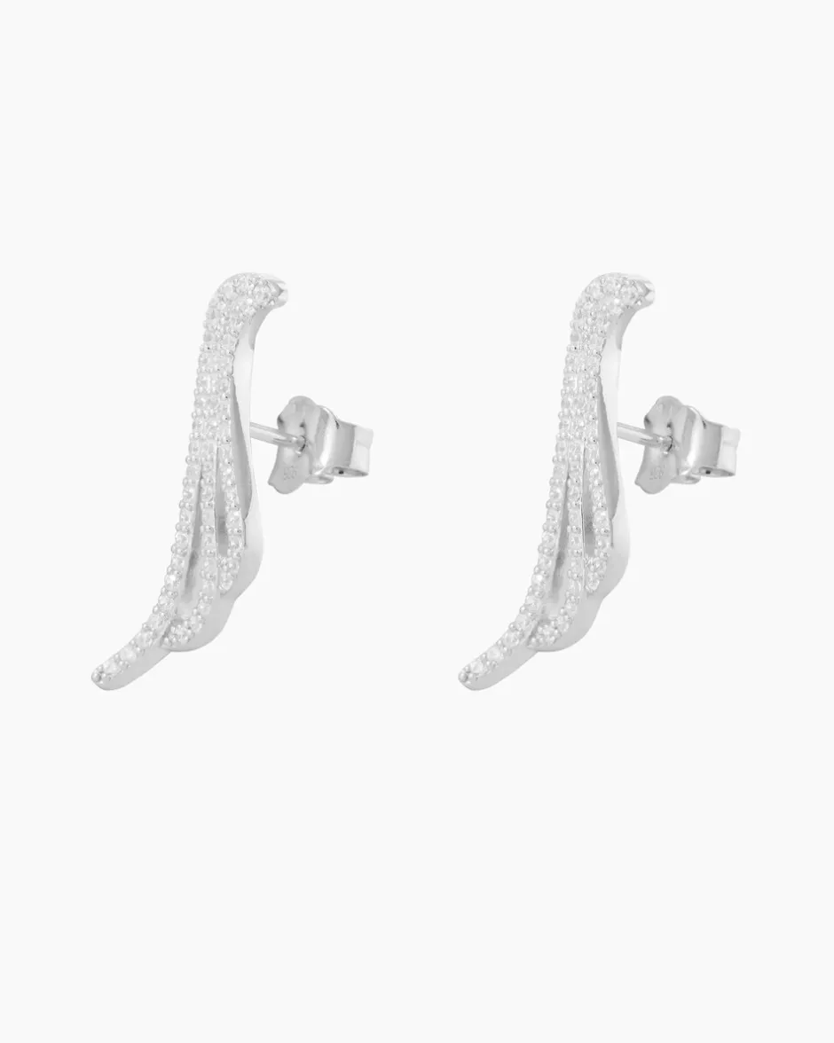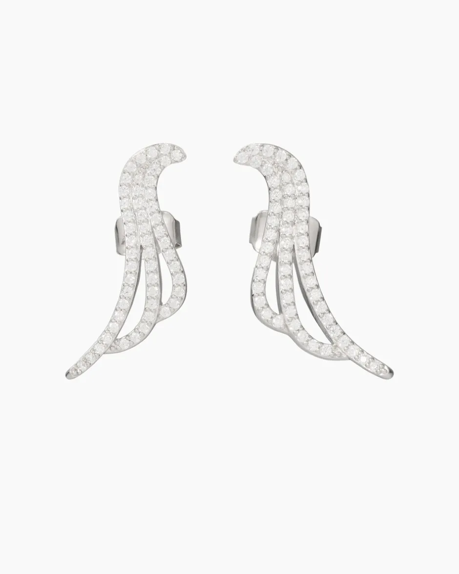 Ohrschmuck zum Verlieben: Die Ohrstecker begeistern durch ihr luftig durchbrochenes Design, das an eine Vogelschwinge erinnert. Die drei Stränge der Ohrstecker sind jeweils mit 51 weißen Zirkonia ausgefasst. Klassisch im Brillantschliff veredelt, sehen die Zirkonia nicht nur aus wie ihre echten Brüder, sie funkeln auch genauso verheißungsvoll. Die gleich großen Glitzersteinchen sind dicht an dicht im Pavé gefasst. Perfekt ergänzt durch die Edelmetall-Basis aus feinstem Sterlingsilber 925. Durch die hauchdünne Rhodiumschicht auf der Oberfläche wird das Glitzern der Zirkonia besonders intensiv reflektiert.