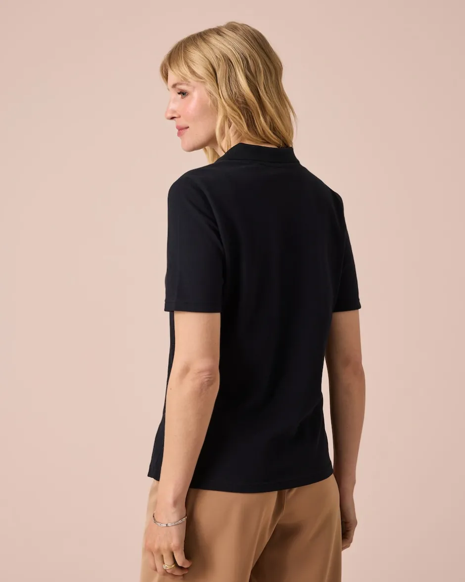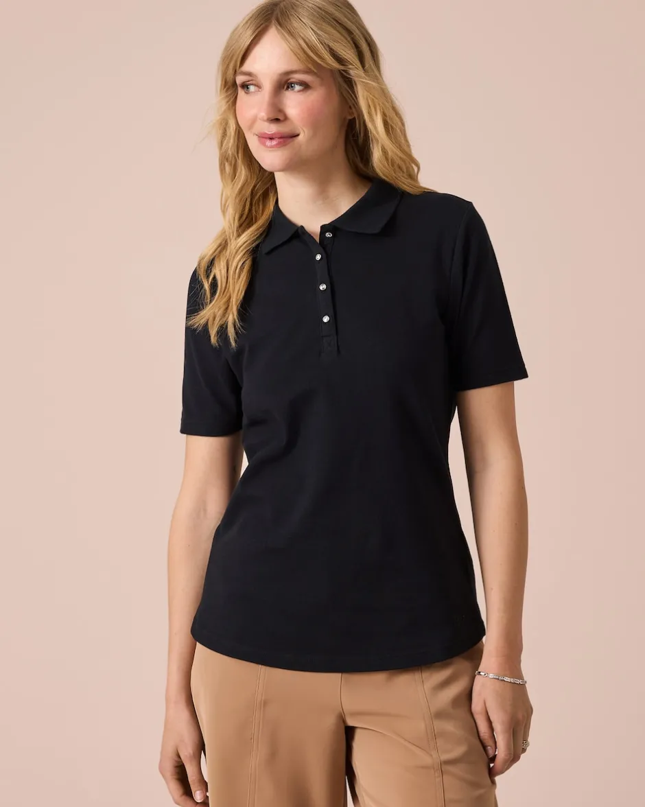 Passt immer: Poloshirts gelten als zeitlose Klassiker der gehobenen Casual-Garderobe. Als besonders attraktives Angebot präsentiert die Linie Helena Vera daher dieses Kurzarm-Shirt aus Baumwoll-Piqué mit Elasthan-Anteil. Das Design zeigt den charakteristischen Polokragen mit kurzer Knopfleiste. Für einen Hauch von Glamour sorgen die Strass-Knöpfe und ein Strass-Logo. Der leicht taillierte Schnitt des Modeklassikers gibt Ihrem Look eine Extraportion Weiblichkeit.