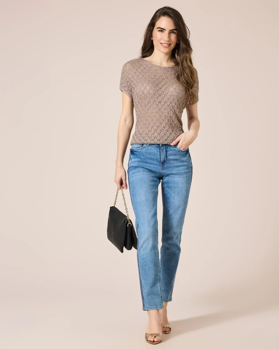 Unser Pullover im Häkelstrick verbindet gekonnt Modebewusstsein mit einem Hauch von Boho-Chic. Die luftige, halbtransparente Optik erzeugt einen modischen und gleichzeitig lässigen Look. Der Rundhalsausschnitt schmeichelt Ihrer Silhouette, während ein dezenter Glanzeffekt das unifarbene Design subtil hervorhebt. Mit der RP Logo Plakette links unten setzen wir unser Markenzeichen. Der Saum im Wellen-Design fügt dem Ganzen eine spielerische Note hinzu. Kombinieren Sie diesen vielseitigen Pullover mit einer farbigen Skinny Jeans für einen legeren Tages-Look oder mit einem eleganten Rock für einen Abendausflug. Mit seinem kombistarken Charakter ist dieser Pullover das Must-have der Saison.
