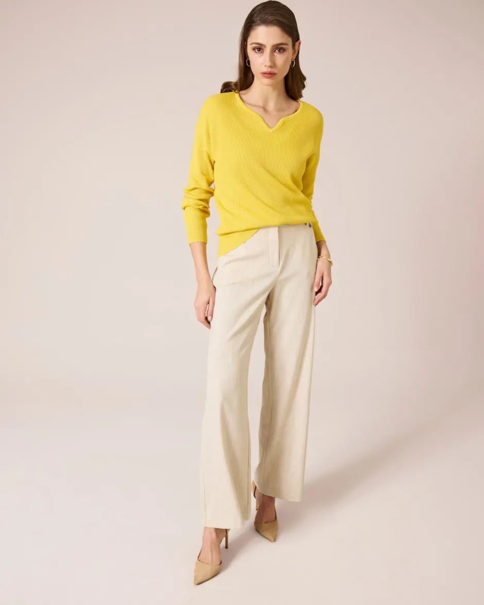 Der Pullover in fröhlichem Zitronengelb ist ein Basicstück mit Pfiff, das Sie oft und gerne tragen werden. Der Pulli begeistert mit einem zarten Rippenstrickmuster und einem raffinierten Herz-Ausschnitt. Die langen Ärmel enden mit engen Bündchen. Und auch in Sachen Material bietet der Pulli nur das Beste. Ein Mix aus Baumwolle und Viskose garantiert perfekten Tragekomfort. Ein Fashion Hit, den Sie mit allem kombinieren können, was Ihr Kleiderschrank hergibt.