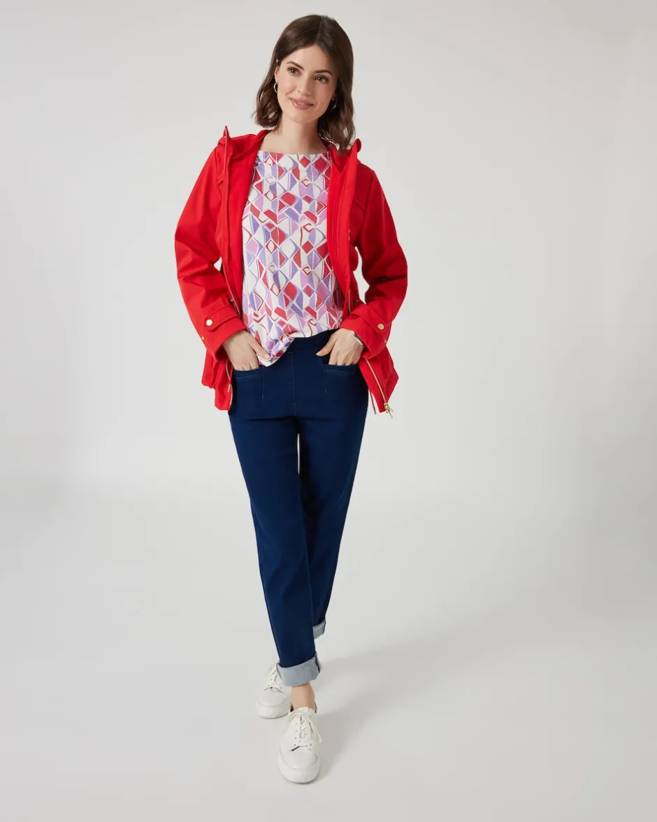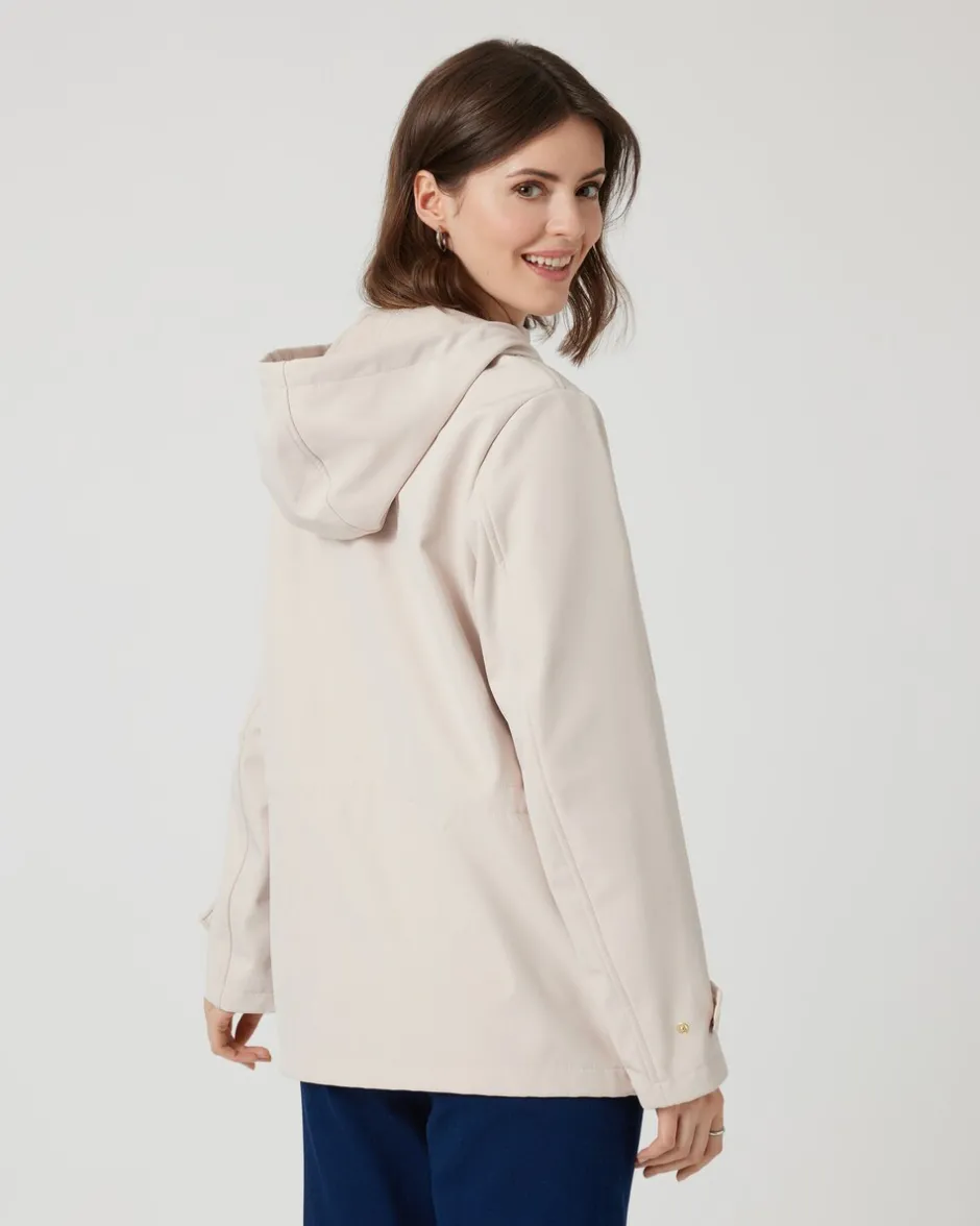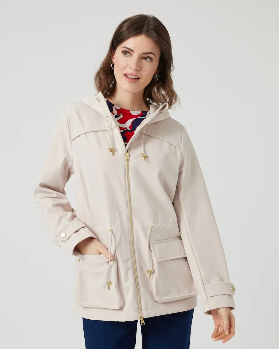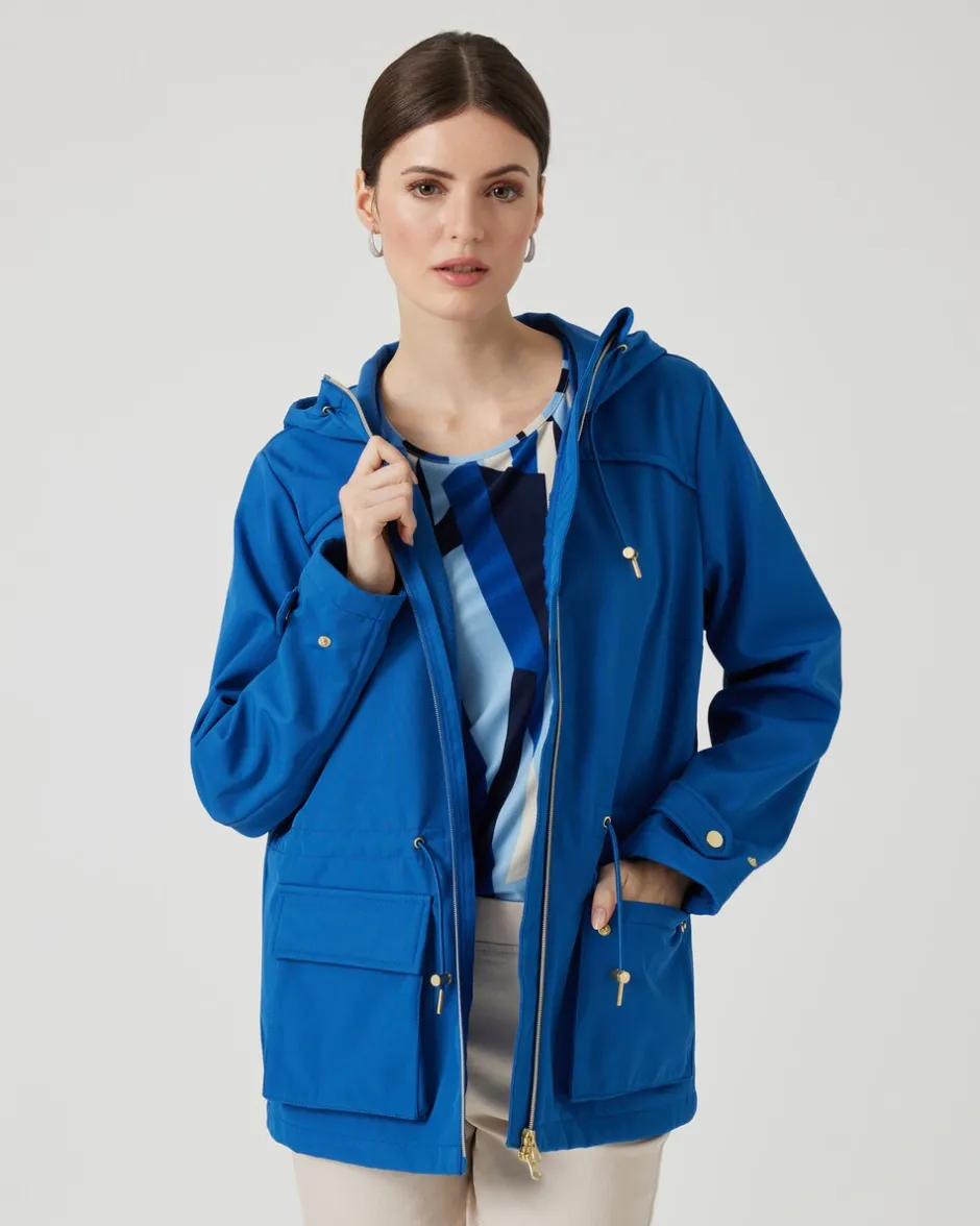 Mit der Softshelljacke von Helena Vera können Ihnen verregnete und stürmischen Herbsttage nichts mehr anhaben. Das hüftlange Modell ist wie ein Parka mit Kapuze und aufgesetzten Taschen geschnitten. In der Taille lässt sich die Jacke mit einem Tunnelzug in der Weite regulieren. Stopper, Zweiwegereißverschluss und Schlaufenösen sind in Goldoptik gearbeitet und setzten spannende Akzente. Freuen Sie sich auf diesen Begleiter für Herbst und Winter, der Ihre Freizeitgarderobe immer lässig komplett macht.