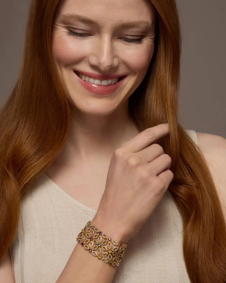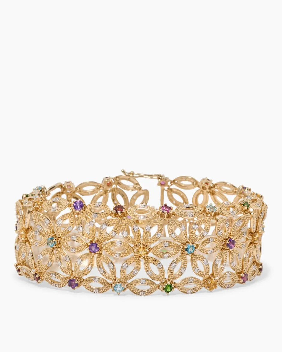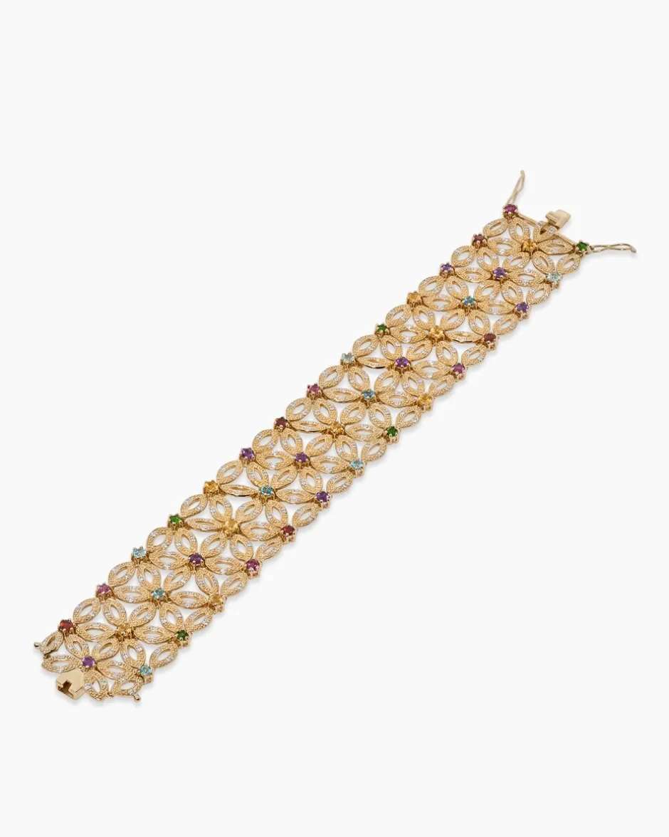 Das breite Armband besteht aus einem filigranen Blüten-Geflecht aus Silber in Gelbgoldoptik. In der Mitte der Blüten sitzen bunte Edelsteine, die im Facettenschliff veredelt einen spektakulären Glanz verströmen. Das zauberhafte Schmuckstück ist mit fünf Chromdiopsiden, fünf Blautopasen, fünf Rhodolithen, fünf Granaten, neun Citrinen, neun Amethysten, vier London Blue Topasen und 196 weißen Zirkonen ausgefasst. Die Kombination dieser wertvollen Edelsteine verleiht dem Armband einen unvergleichlichen Glanz und eine faszinierende Ausstrahlung.