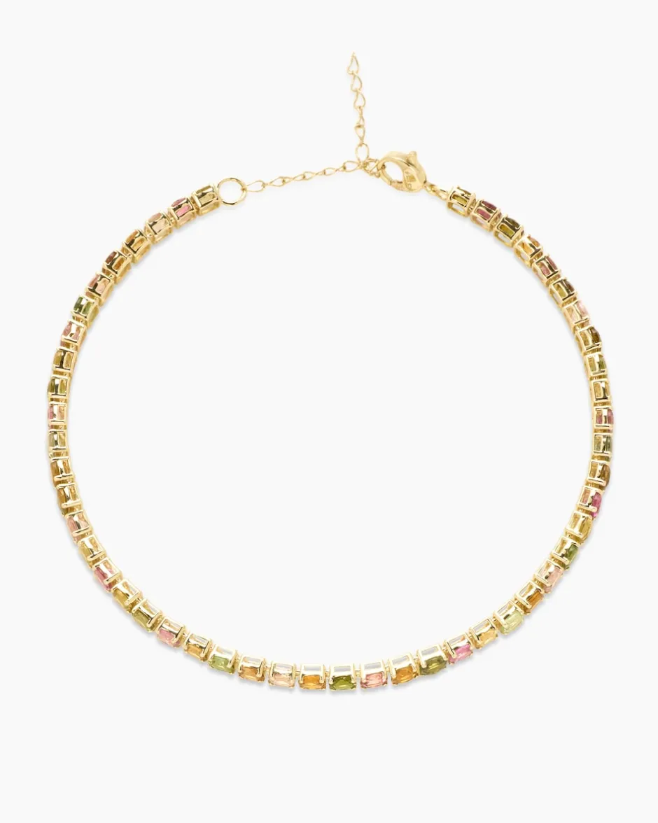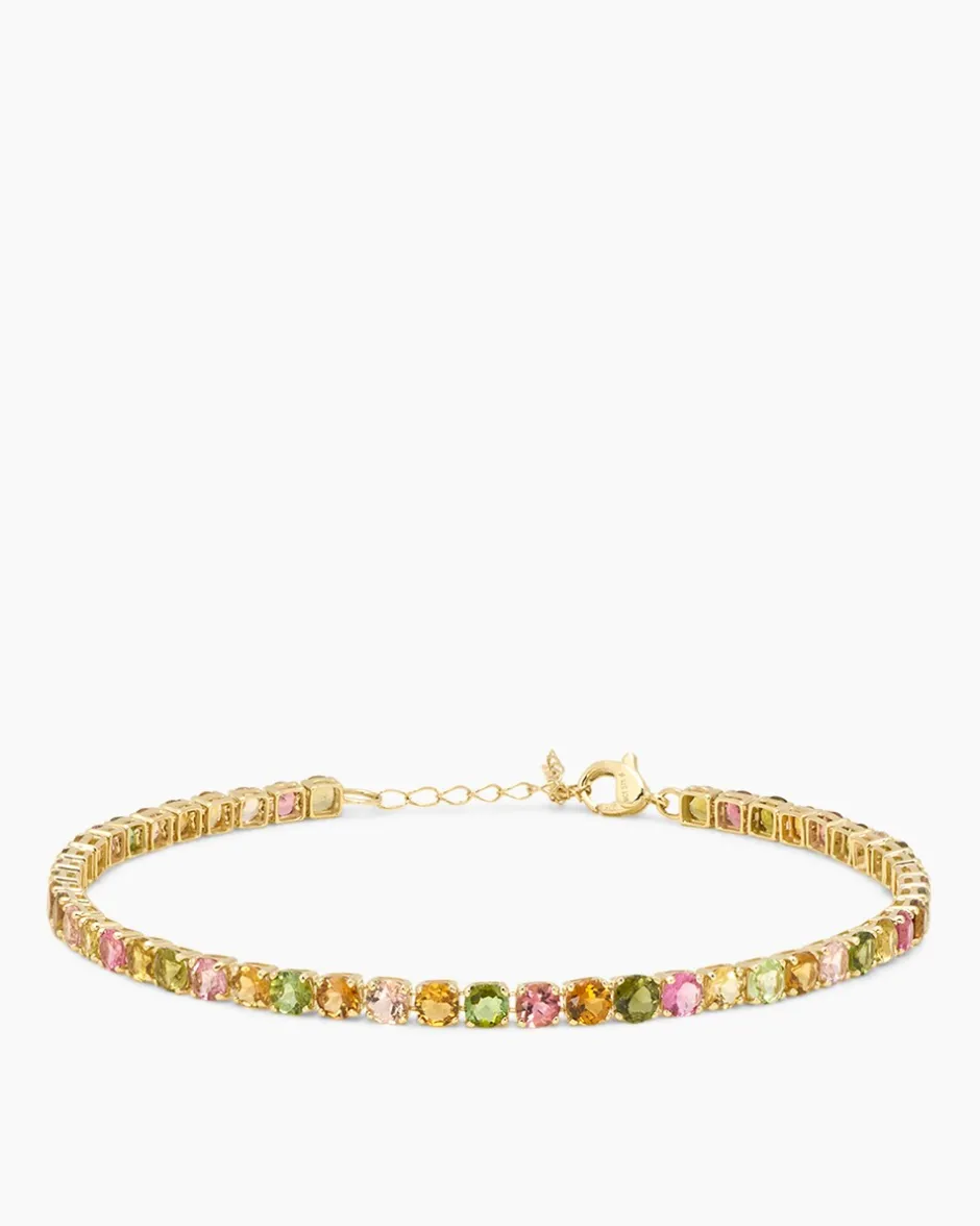 Wenn Sie auffallenden Edelsteinschmuck in fröhlichen Farben schätzen, werden Sie sich sofort in dieses bezaubernde Armband verlieben. Der Armschmuck besteht aus runden Turmalinen. Im Facettenschliff veredelt und in Krappen gefasst, leuchten die Turmaline in verschiedenen Farben. Das Armband ist ca. 17,5 cm lang und verfügt über ein 3,5 cm Verlängerungskettchen. Verschlossen wird das Armband mit einem sicheren Karabiner aus Gelbgold 375. Mit diesem Accessoire runden Sie jeden Look harmonisch ab.