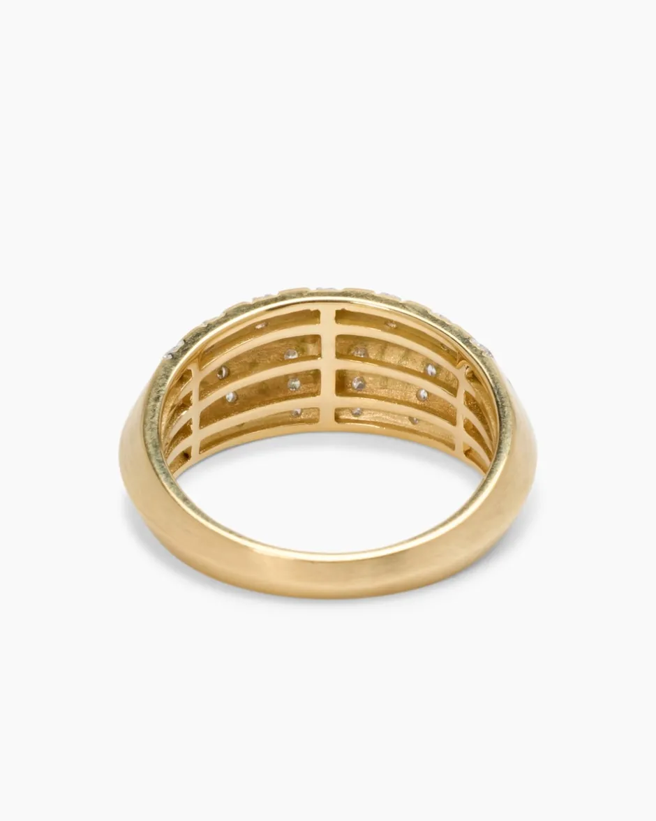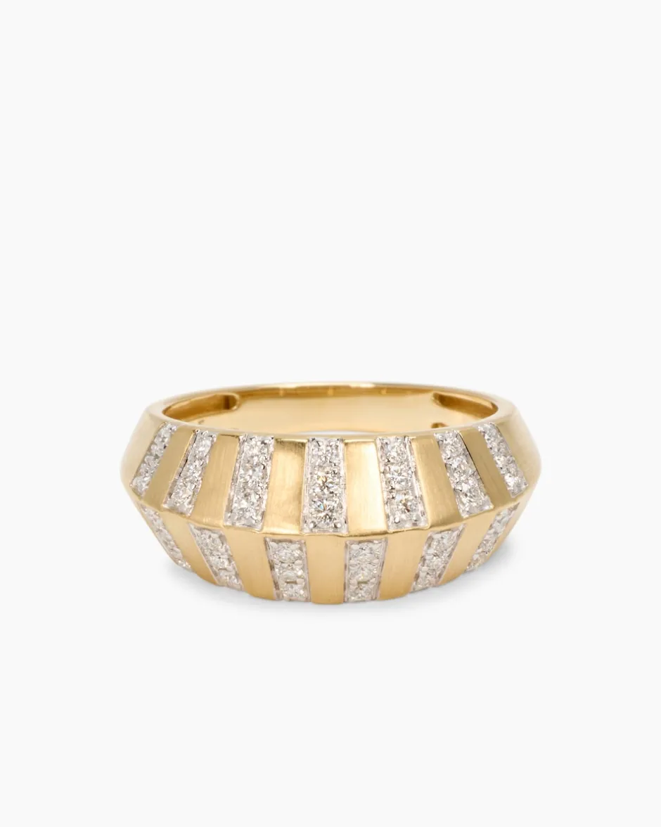 39 lupenreine Brillanten in getöntem Weiß zieren den exquisiten Ring von Diamantaire. Ein besonderer Eyecatcher: Das Spiel mit Formen und Farben, das das außergewöhnliche Schmuckstück auszeichnet. Die Ringschiene ist zwar im Stil eines Bandrings gestaltet, verjüngt sich aber vom opulenten, ca. 9 mm breiten Ringkopf nach hinten. Je drei Brillanten sitzen in Krappen nebeneinander eingebettet in mattiertes 585er Gelbgold. Sie sind so angeordnet, dass sie in schmalen Reihen auf die mittige Kante zulaufen, die das besondere Charisma des Rings ausmacht. Haben Sie ein Faible für Stil und modernes Design? Dann liegen Sie mit diesem wertvollen Ring buchstäblich goldrichtig.