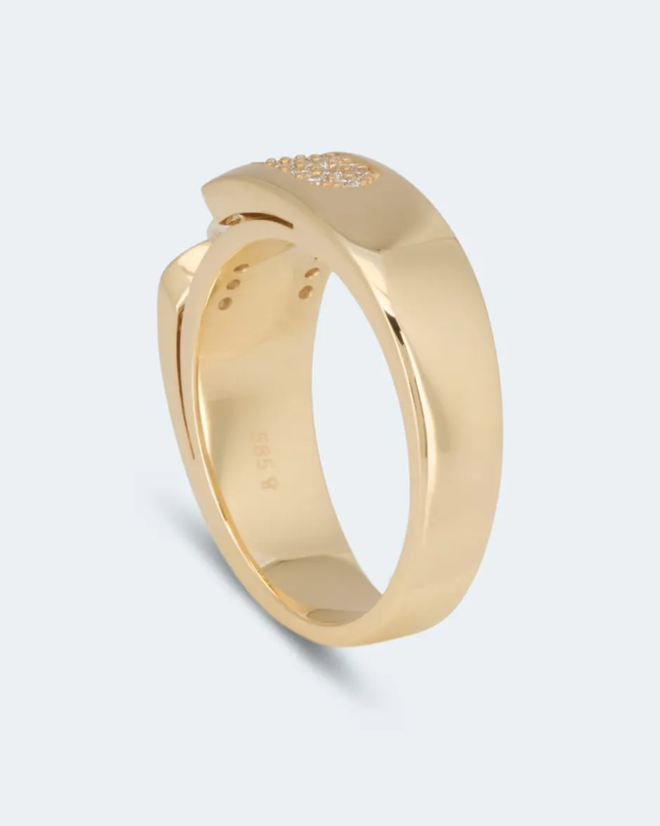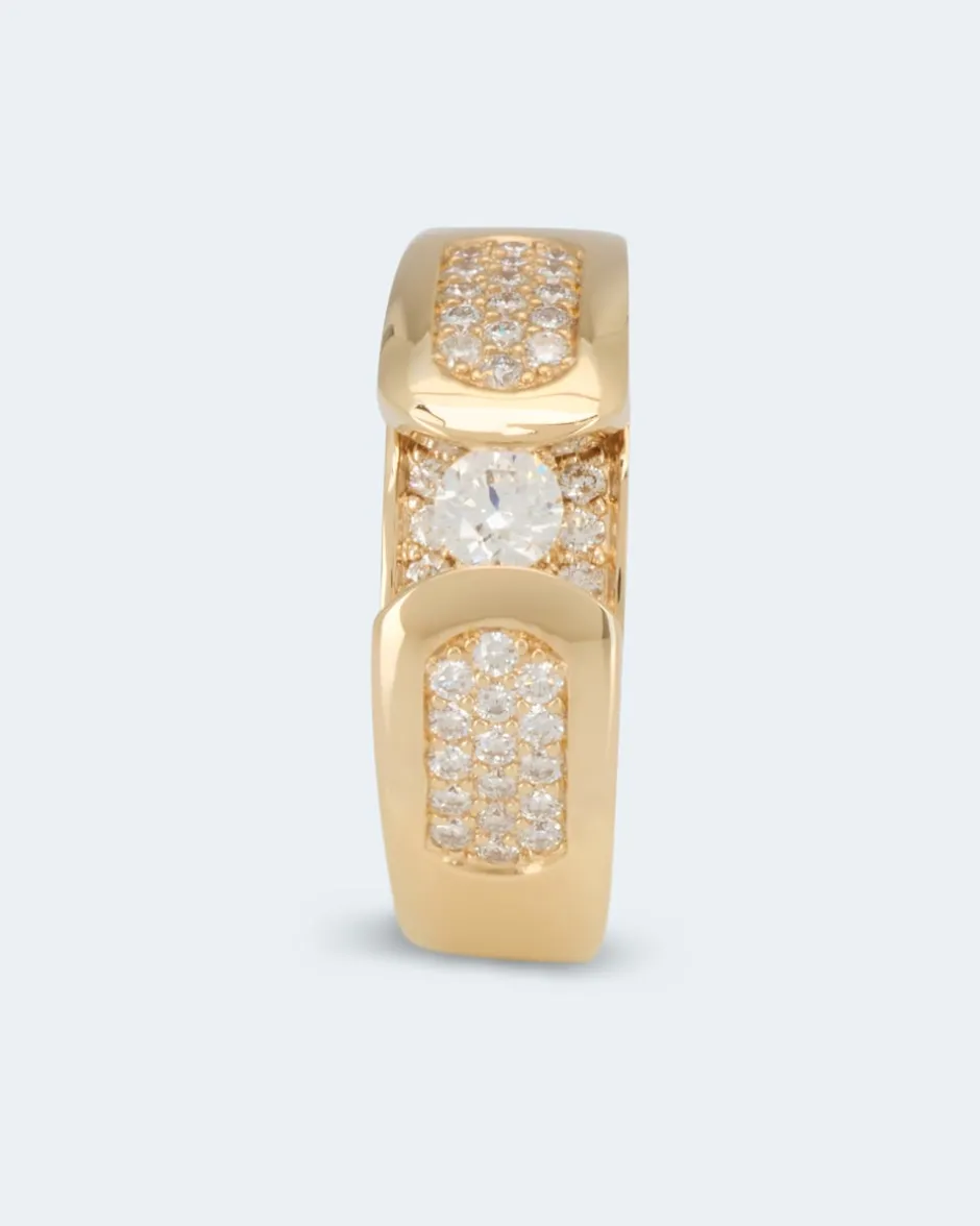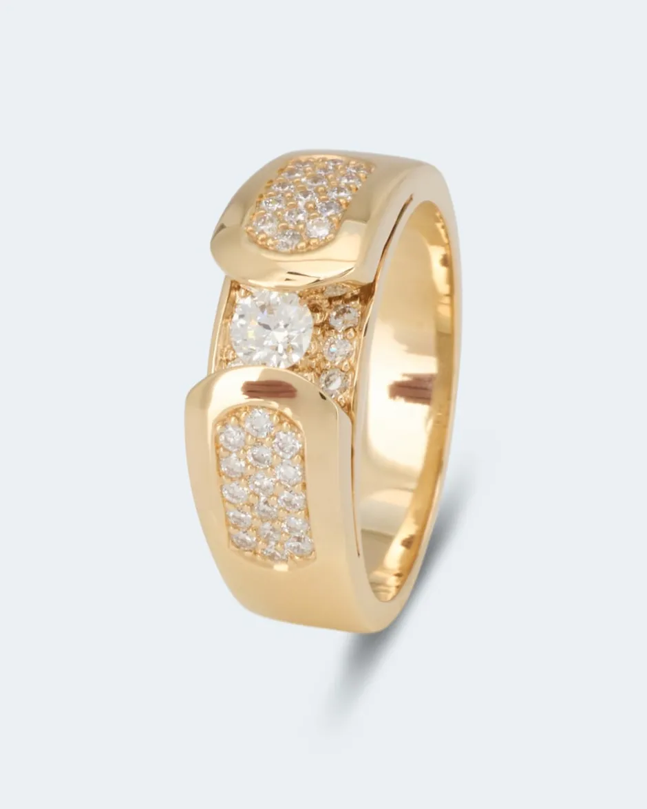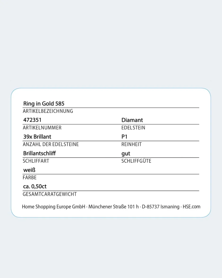 Hier trifft glänzendes 585er Gold auf puren Brillantglanz: In der Mitte sitzt ein 3,5 mm großer Brillant in Spannoptik. Er ist unterlegt mit einer Scheibe, auf der ebenfalls Brillanten gefasst sind – genau wie auf den Ringschultern. Die insgesamt 39 Brillanten bescheren Ihnen ein Gewicht von beeindruckenden 0,5 Karat. Der Ring wird exklusiv in Deutschland gefertigt. Sie erhalten dazu ein Zertifikat.