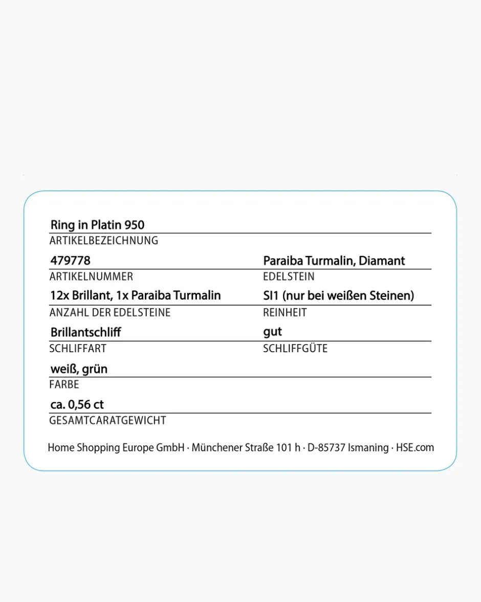 Lassen Sie sich verzaubern von diesem exquisiten Ring aus der Marvin Kulik Linie. Zentraler Blickfang ist der herrliche, zartgrüne Paraiba Turmalin mit einem Edelsteingewicht von rund 0,36 ct. Der bildschöne Mittelstein ist umgeben von 12 strahlenden Brillanten in der Reinheit SI1 und in guter Schliffqualität. In perfekter Harmonie zum hellen Funkeln steht das kühl elegante Edelmetall Platin. Ein kostbares Meisterwerk filigraner Schönheit und Edelsteineleganz für alle Fans von ausgesuchtem Brillantschmuck.