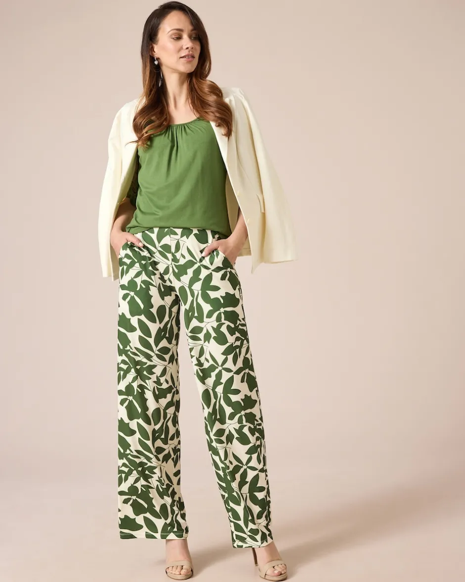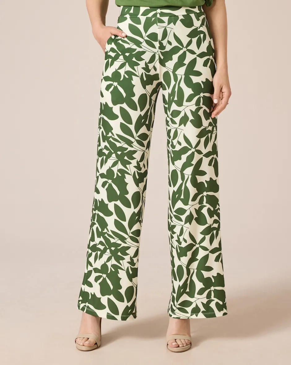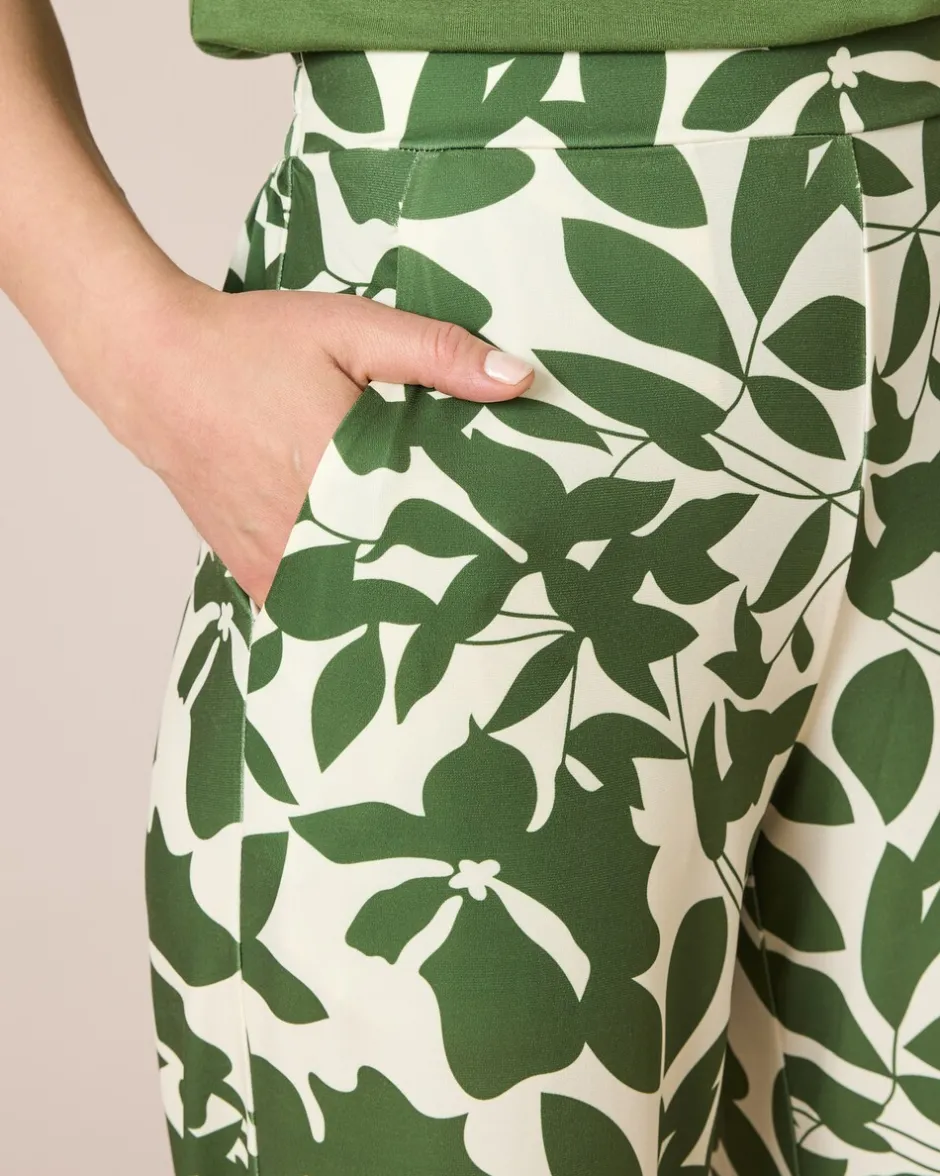 Reinschlüpfen, wohlfühlen und gut aussehen. Die Hose begeistert mit einem modischen Blätterdruck und einem weiten, gerade geschnittenen Bein. Der bequeme Schlupfbund ist hinten gesmokt, sodass die Hose perfekt fällt. Zusammen mit dem weiten Bein hat die Hose einen tollen figurschmeichelnden Effekt. Lässige Seitentaschen machen das Design komplett. Die Jerseyhose gibt es in Kurz- oder Normalgrößen zur Wahl und kann sowohl mit High Heels als auch mit Sneakers getragen werden – Sie geben immer eine gute Figur ab.