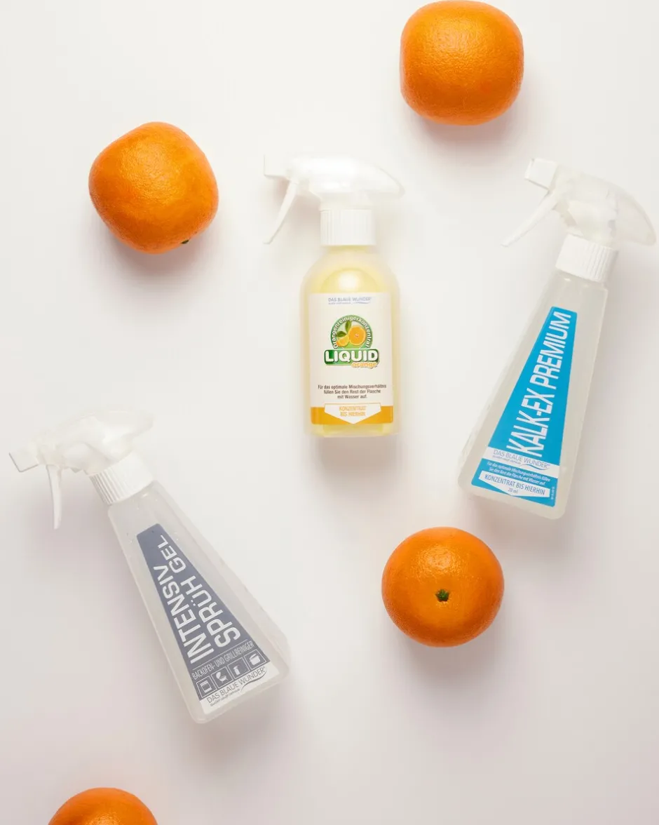| Anwendung: | Kalk-Ex pur oder verdünnt auf die zu entkalkende Oberfläche geben, kurz einwirken lassen und mit viel Wasser nachspülen. Backofen Reiniger pur aufsprühen, Umgebung vor Spritzern schützen, einwirken lassen und mit viel Wasser nachspülen. Orangenreiniger wird bei Verdünnung milchig. Nach Anwendung gereinigte Oberflächen feucht nachwischen. |