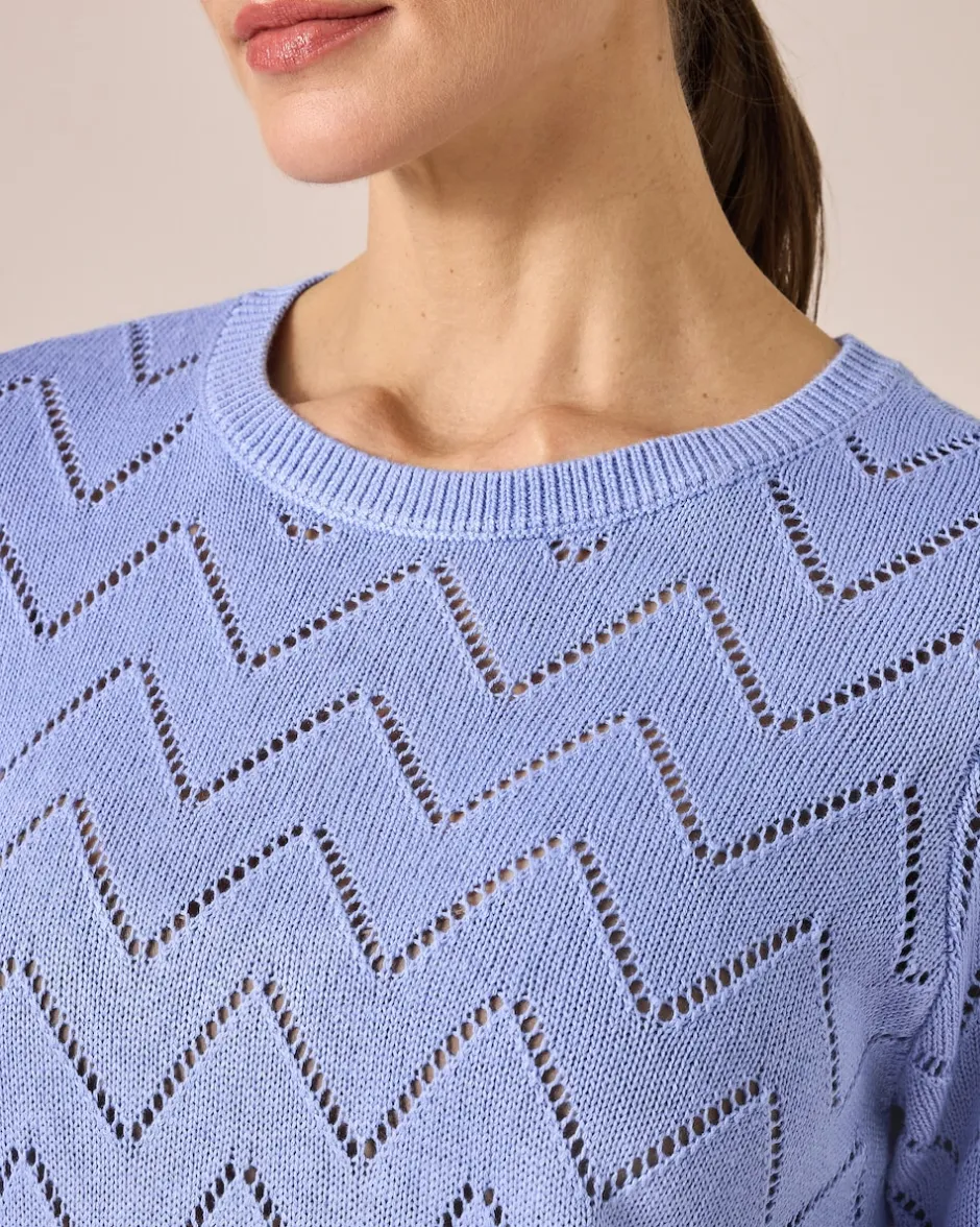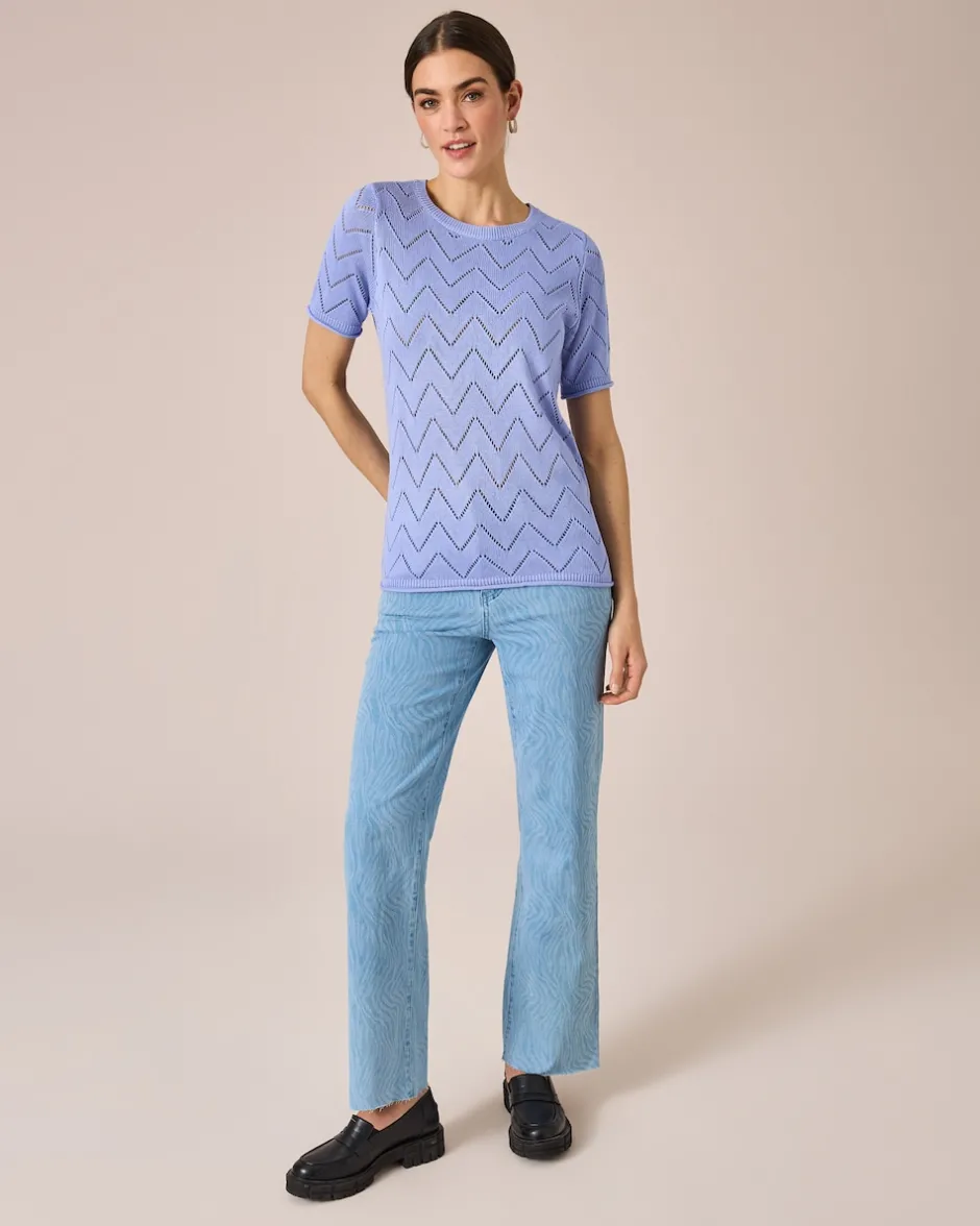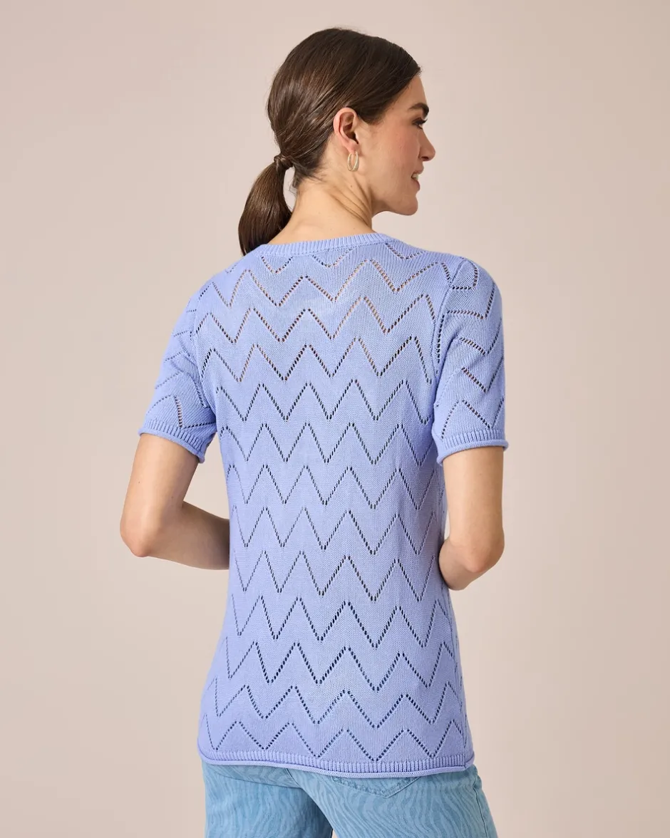 Entdecken Sie diesen reizenden Kurzarmpullover aus der neuen Fiora Blue Kollektion. Die feine Qualität zeigt ein modisches Zick-Zack-Muster, gestaltet als aufwendiger Ajourstrick. Als weiteres hübsches Detail fallen die Rollkanten an Ärmeln und Saum ins Auge. Der Pullover hat einen Rundhalsausschnitt und ist leicht tailliert. Ein toller Hingucker für die Frühlings- und Sommersaison.