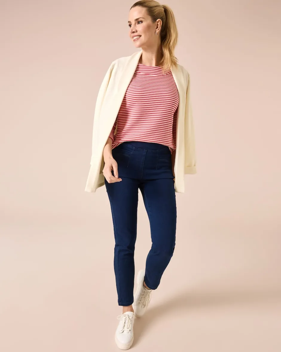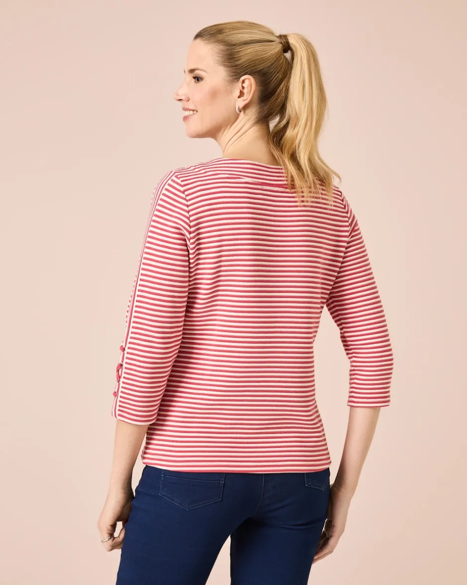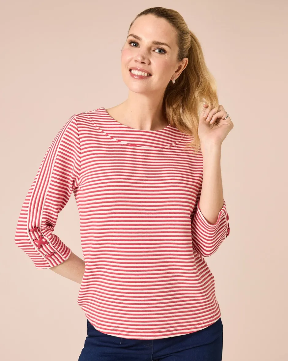 Entdecken Sie unseren top-modischen Sweater in hochwertiger Lux Ottoman Qualität. Mit seinen schmalen Streifen und dem Rundhalsausschnitt mit breiter Blende bringt er einen frischen Wind in Ihre Garderobe. Der 3/4 Arm mit Querstreifen und Deko-Schnürung am Armende sorgt für ein besonderes Detail, während der gerade Saum eine optimale Passform garantiert. Dieses Statement-Stück ist mehr als nur ein Sweater, es ist ein Ausdruck von Eleganz und Modernität. Ob zu einer Jeans für einen lässigen Stadtbummel oder zur Stoffhose für den professionellen Auftritt im Büro – dieser Sweater passt einfach immer.