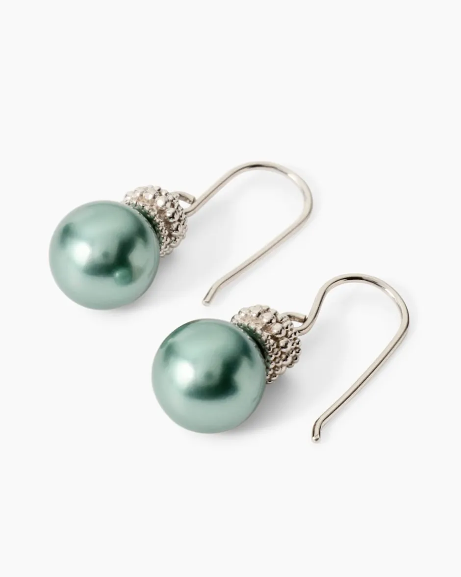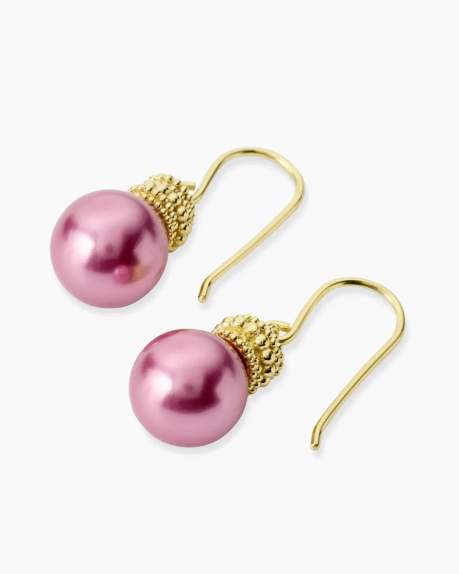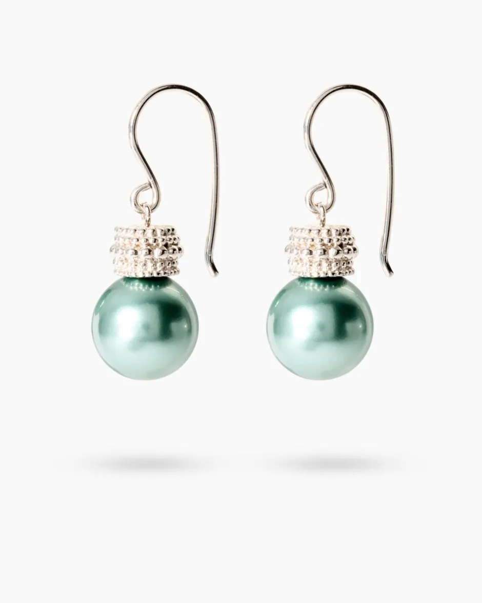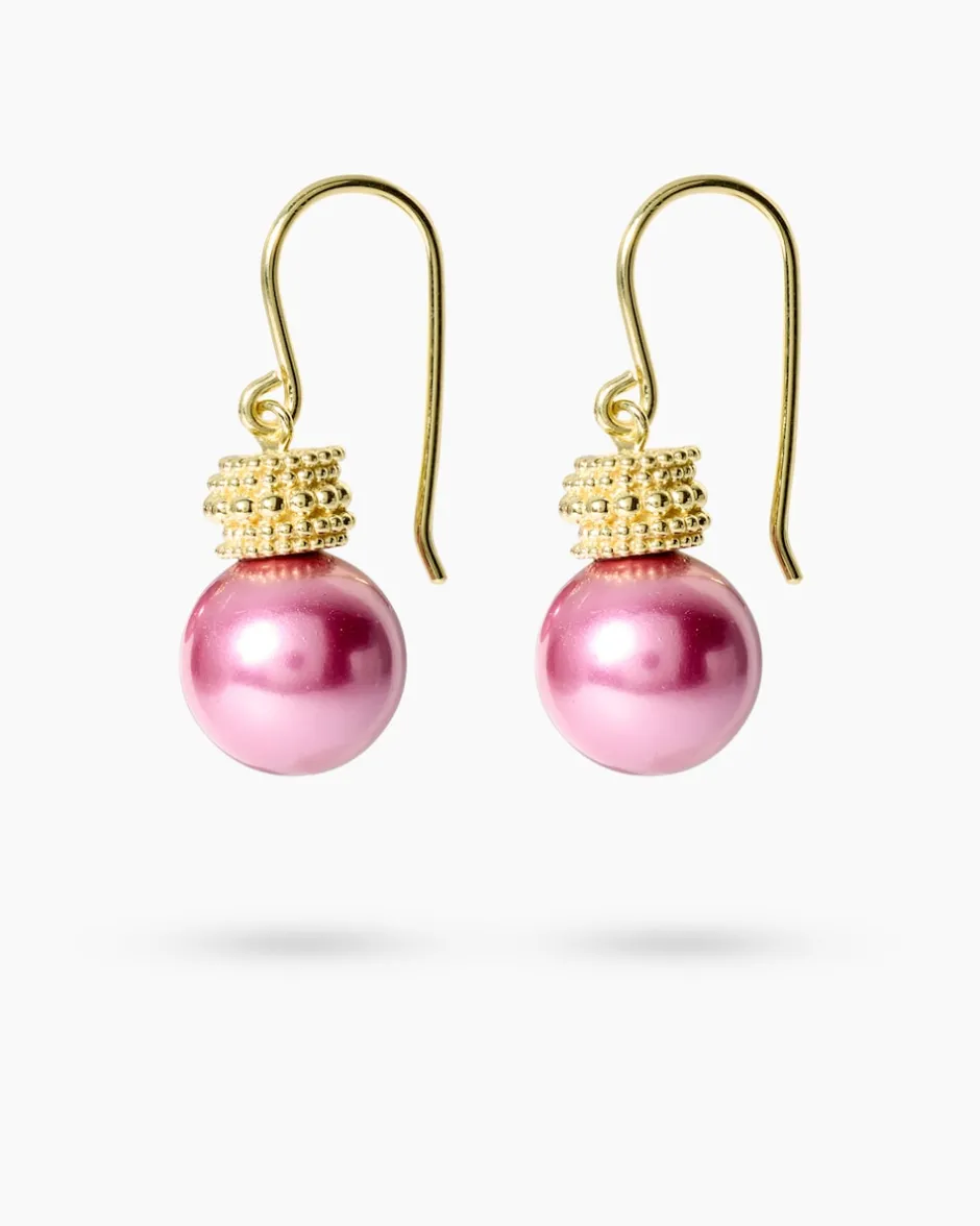Es handelt sich um Schmuck mit Muschelkernperlen, die mit einer speziellen Technik von Hand in Form geschliffen, in einem aufwendigen Spezialverfahren gefärbt und nachbehandelt werden, um eine erstklassige Farbe und einen wunderschönen Lüster zu garantieren. Die Ohrringe stammen aus der eigenen Schmuckmanufaktur in Pforzheim, die bereits in der dritten Generation fertigt.
