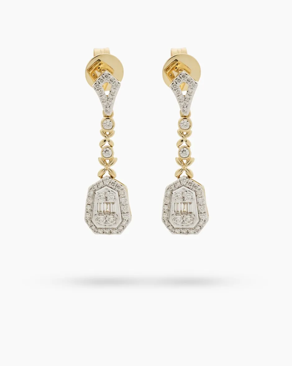 Je drei Diamanten und 38 Brillanten geben diesem hängenden Ohrschmuck aus der Linie Diamantaire sein charakteristisches Funkeln. Die lupenreinen Steine sind in Kanal-, Krappen- und Zargenfassungen angeordnet und ergeben ein barockes Gesamtkunstwerk mit Glamour-Effekt. Die luxuriösen Steine haben zusammen ca. 0,50 Karat und sind in 585er Gold gebettet. Im Bereich der Fassungen ist das Edelmetall rhodiniert, was die Diamanten und Brillanten noch eindrucksvoller erstrahlen lässt. Gönnen Sie sich diesen besonderen Schmuck für Ihre private Kollektion.
