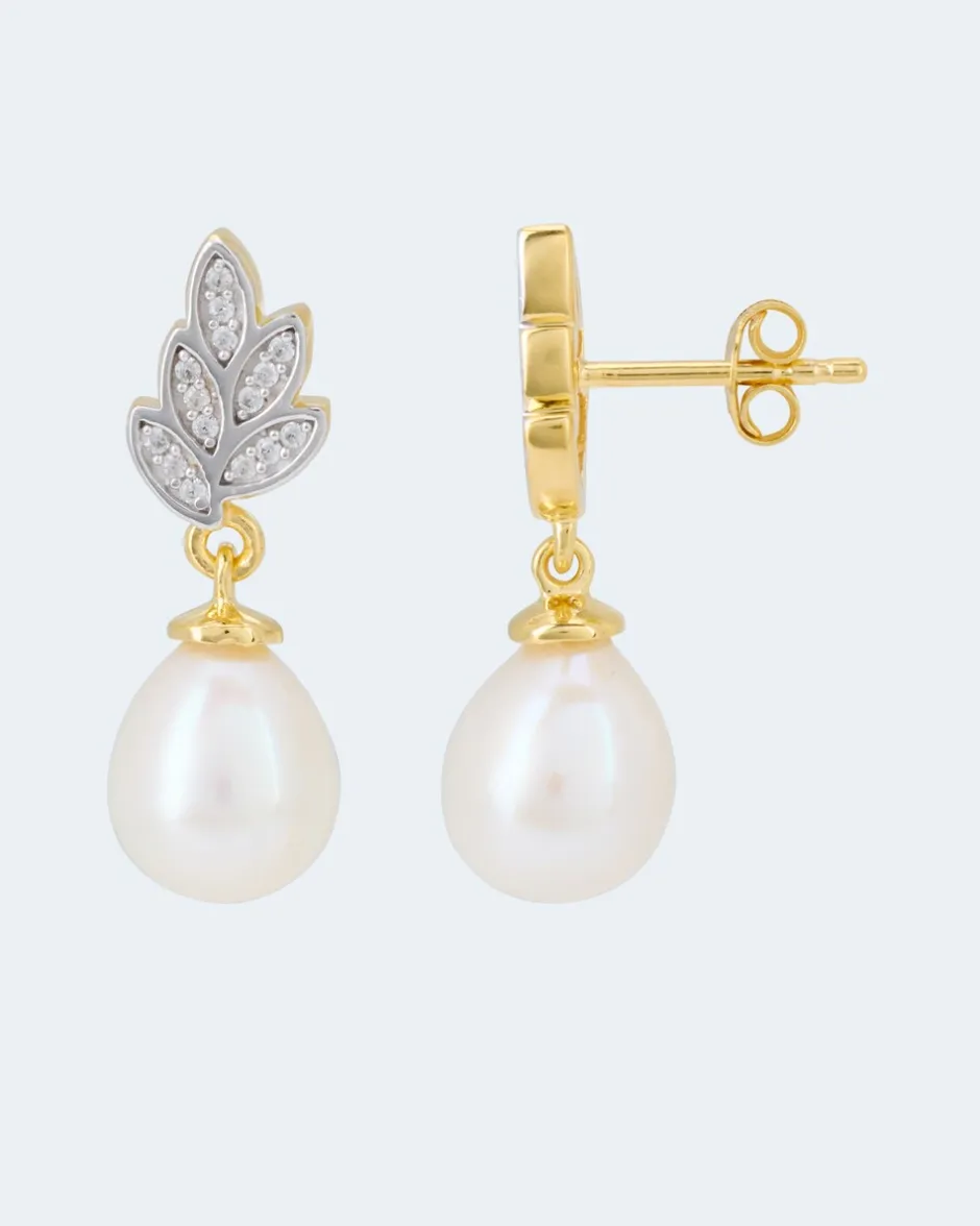 Unterstreichen Sie Ihre natürliche Schönheit mit diesen Perlen-Ohrsteckern im Romantik-Look. Ob bei einer festlichen Veranstaltung, im Büro oder bei einem Abendessen – diese Ohrstecker sind immer der perfekte Begleiter. Sie sind aus 925er Sterlingsilber gefertigt und gelbvergoldet. Das Schmuckdesign zeigt zwei blattförmige Elemente, an denen der perlen-Tropfen übe reine Kappe beweglich befestigt ist. Für ein aufregendes Funkeln sind die „Blätter“ mit je 15 Zirkonen in Krappen besetzt. Ein Must-have für Perlenschmuckfans.