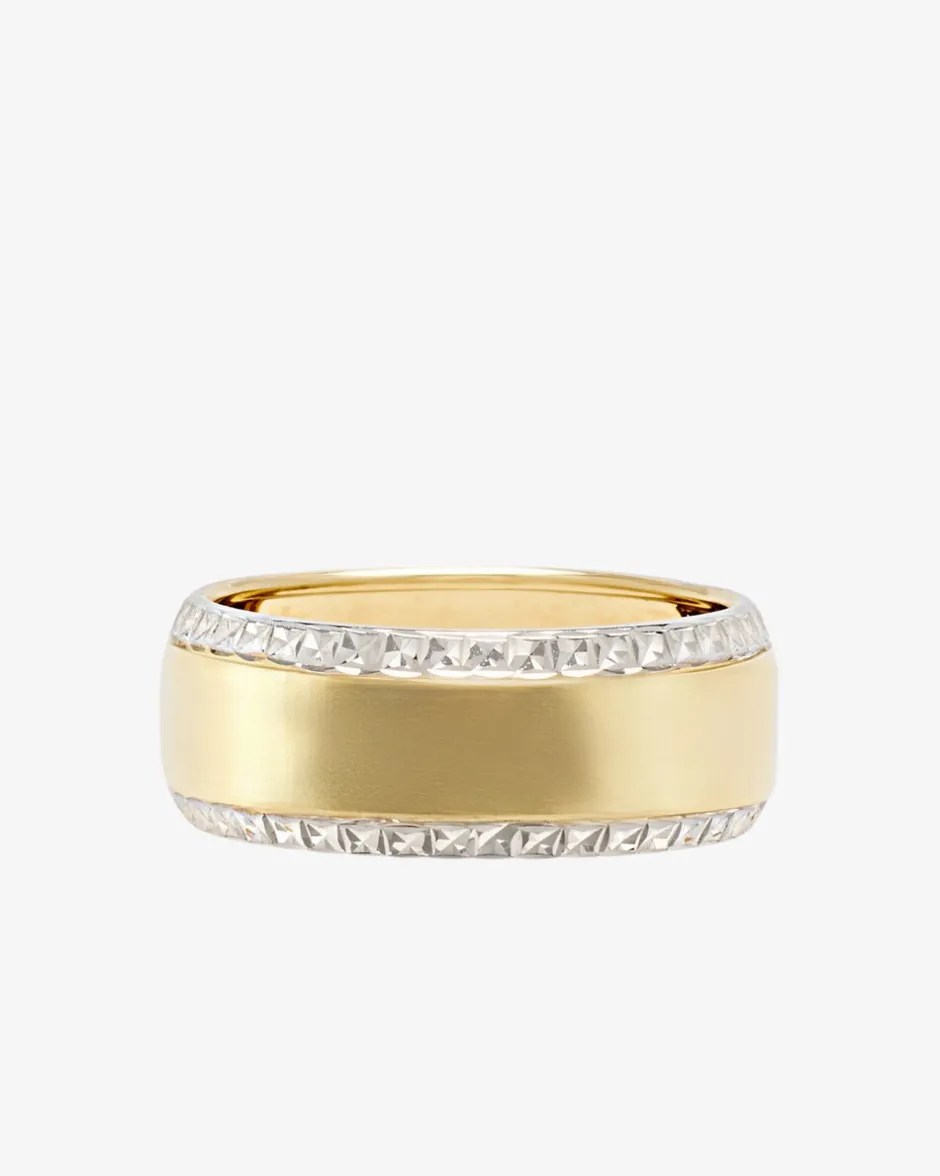 Zeitlos-schön und herrlich glänzend! Der Ring aus hochglanzpoliertem Gelbgold 585 ist mit einer Rhodiumschicht versehen und diamantiert. Die Ränder sind diamantgeschliffen und sorgen für einen glänzenden Akzent. Ein stilvoller Eyecatcher, den Sie jeden Tag tragen können. Das Accessoire ist aber auch ein schlicht-eleganter Begleiter zu besonderen Anlässen.