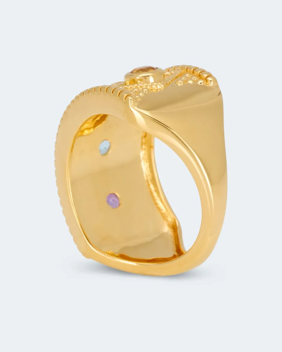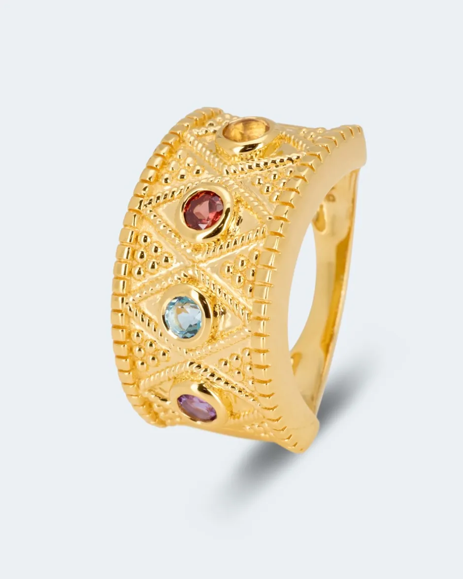 Tauchen Sie ein in die bunte Welt der Edelsteine mit unserem kunstvoll strukturierten Ring aus gelbvergoldetem 925er Sterlingsilber. Der breite, hochglanzpolierte Ringkopf ist mittig besetzt mit 4 verschiedenfarbigen, rund facettierten Edelsteinen: 1 Granat, 1 Swiss Blue Topas, 1 Citrin und 1 Amethyst. Jeder Stein, mit einem Durchmesser von ca. 3,0 mm, wird sicher von einer Zargenfassung gehalten. Mit insgesamt etwa 0,49 ct bringt unser Multi-Edelstein-Ring einen faszinierenden Regenbogen voller Farben an Ihren Finger.