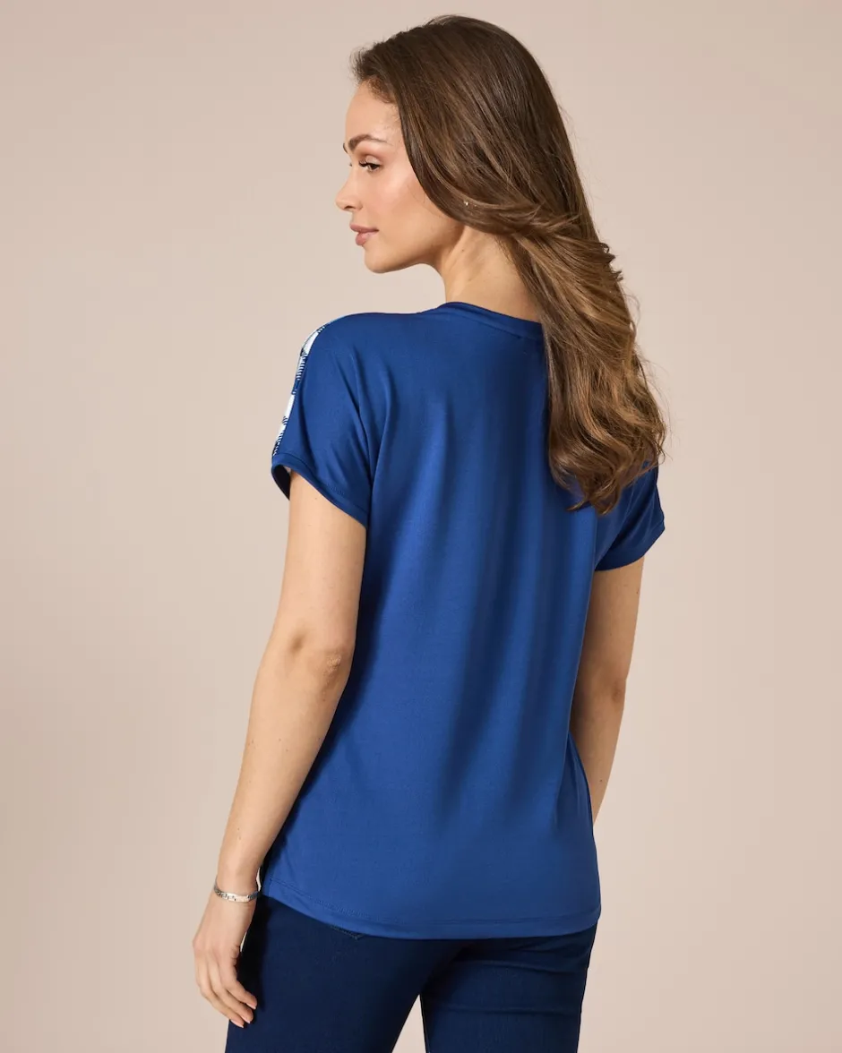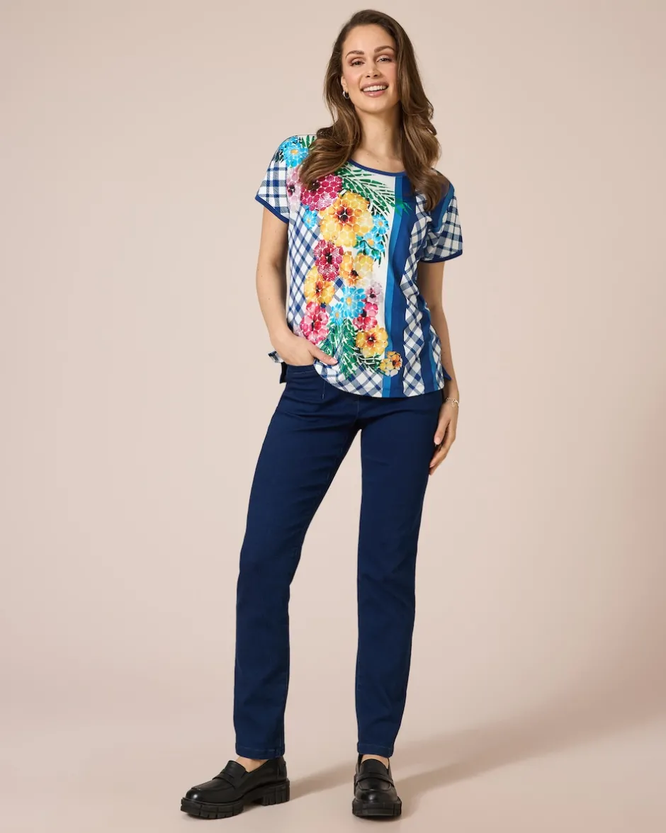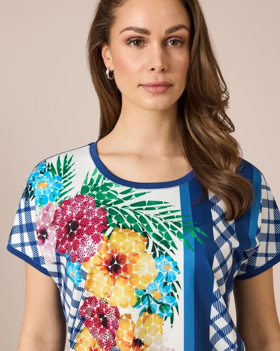 Wenn Sie feminin-verspielte Mode in modernen Blumen-Designs lieben, dann kommen Sie an diesem Shirt aus der neuen Helena Vera Kollektion nicht vorbei. Auf der Vorderseite ist es kunterbunt bedruckt mit einem fröhlichen Motiv-Mix aus floralen und grafischen Elementen. Die Rückseite ist unifarben gehalten. Der Rundhalsausschnitt und kurze, überschnittene Ärmel machen den stylischen Look komplett.