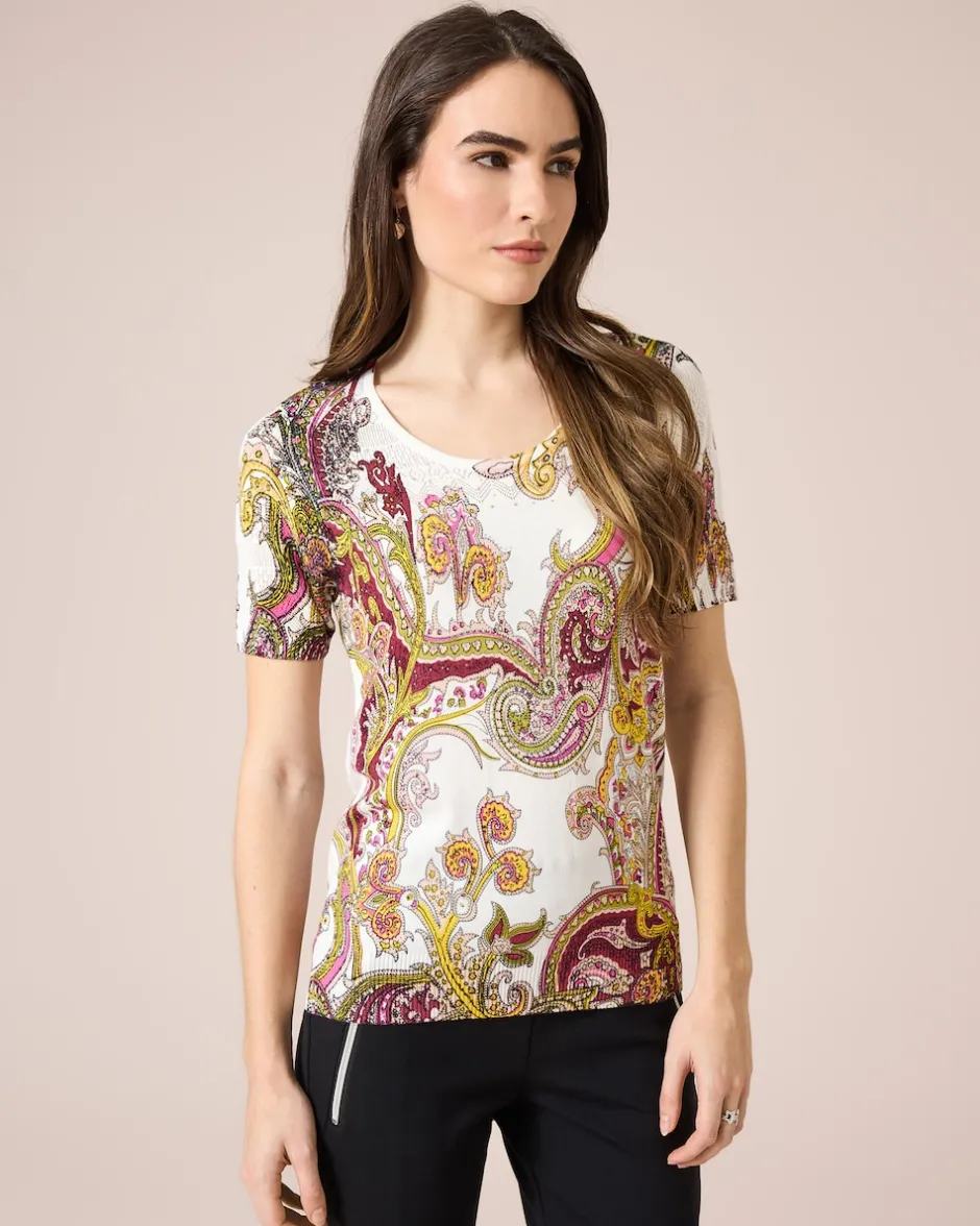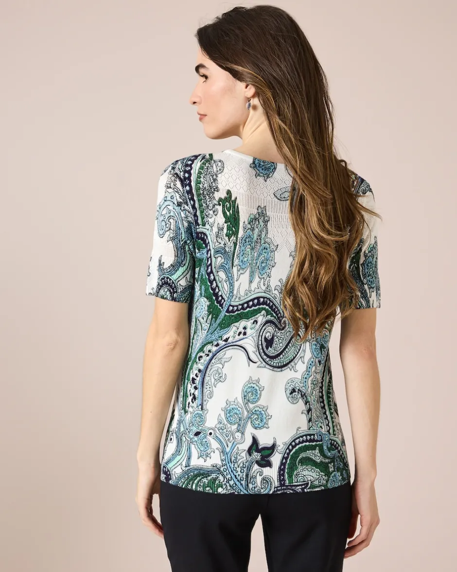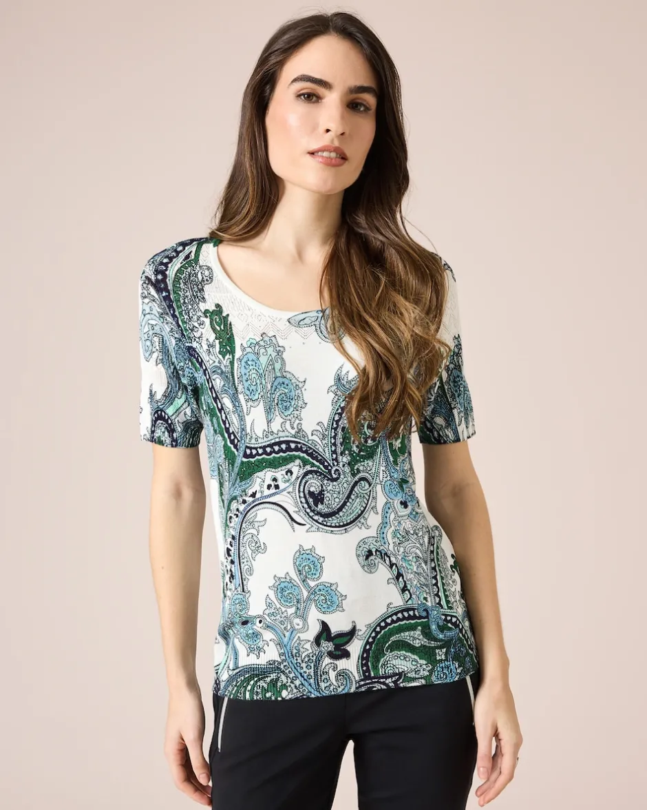 Verleihen Sie Ihrem Look einen bohemen Touch mit unserem Shirt mit Paisleydruck. Das Design wird durch ein feines Strassdekor veredelt, das für einen funkelnden Touch sorgt. Mit seinem halben Arm und weiten Rundhalsausschnitt bietet es eine bequeme Passform und ist perfekt für schöne Tage. Der gerippte Saum verleiht dem Shirt eine strukturierte Silhouette, während der hautsympathische Viskose-Mix für hohen Tragekomfort sorgt. Kombinieren Sie dieses vielseitige Shirt mit einer Jeans für einen lässigen Alltagslook oder mit einem eleganten Rock für ein festliches Dinner. Egal zu welchem Anlass, dieses Shirt bringt immer den richtigen Stil mit.