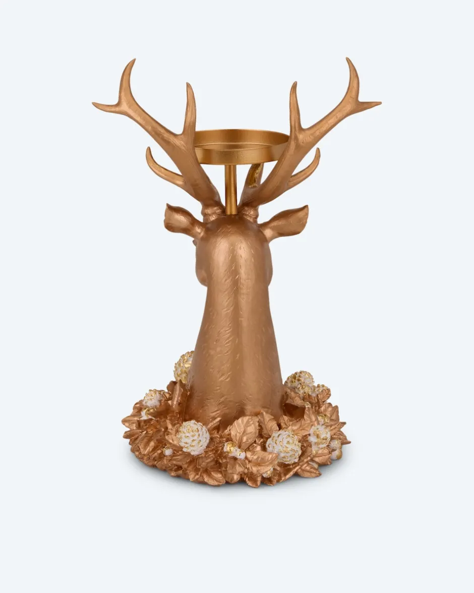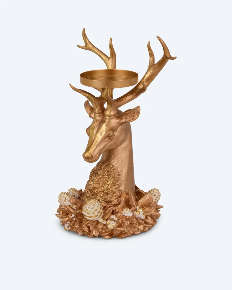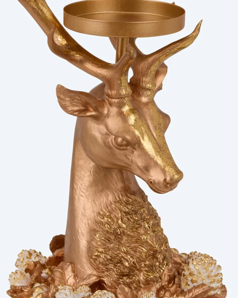 Dieser edle Kerzenständer setzt in allen Ihren Räumen glamouröse Akzente. Egal, wo Sie die Deko platzieren, sie wird durch ihr modernes Hirschbüsten-Design zum unwiderstehlichen Blickfang. Die edle Goldoptik wirkt unwiderstehlich glamourös und harmoniert mit jedem Einrichtungsstil – von klassisch-gediegen bis postmodern. Optimiert für die LED-Stumpenkerzen von Flambiance, aber auch für alle anderen geeignet. Die edle Aufmachung eignet sich optimal für Ihre Herbst- und Winter-Deko, kann aber auch ganzjährig eingesetzt werden.