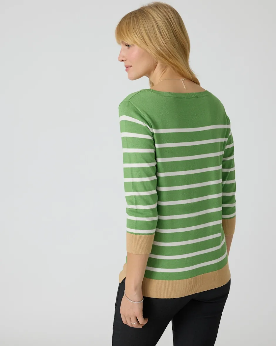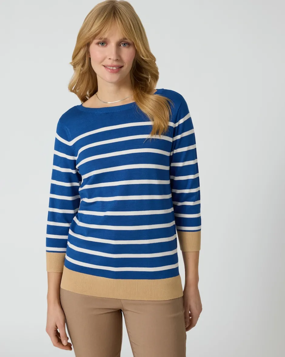 Dieser süße Streifenpullover bringt frischen Wind in modische Alltags-Stylings. Seine Besonderheit sind die Kontrastbündchen an Ärmeln und Saum, die dem beliebten Breton-Design einen individuellen Akzent verleihen. Der Schnitt ist betont feminin mit U-Boot-Ausschnitt, ¾-Ärmeln und leicht taillierter Silhouette. Einfach eine Jeans oder Chino dazu, fertig ist der charmante Casual-Look.