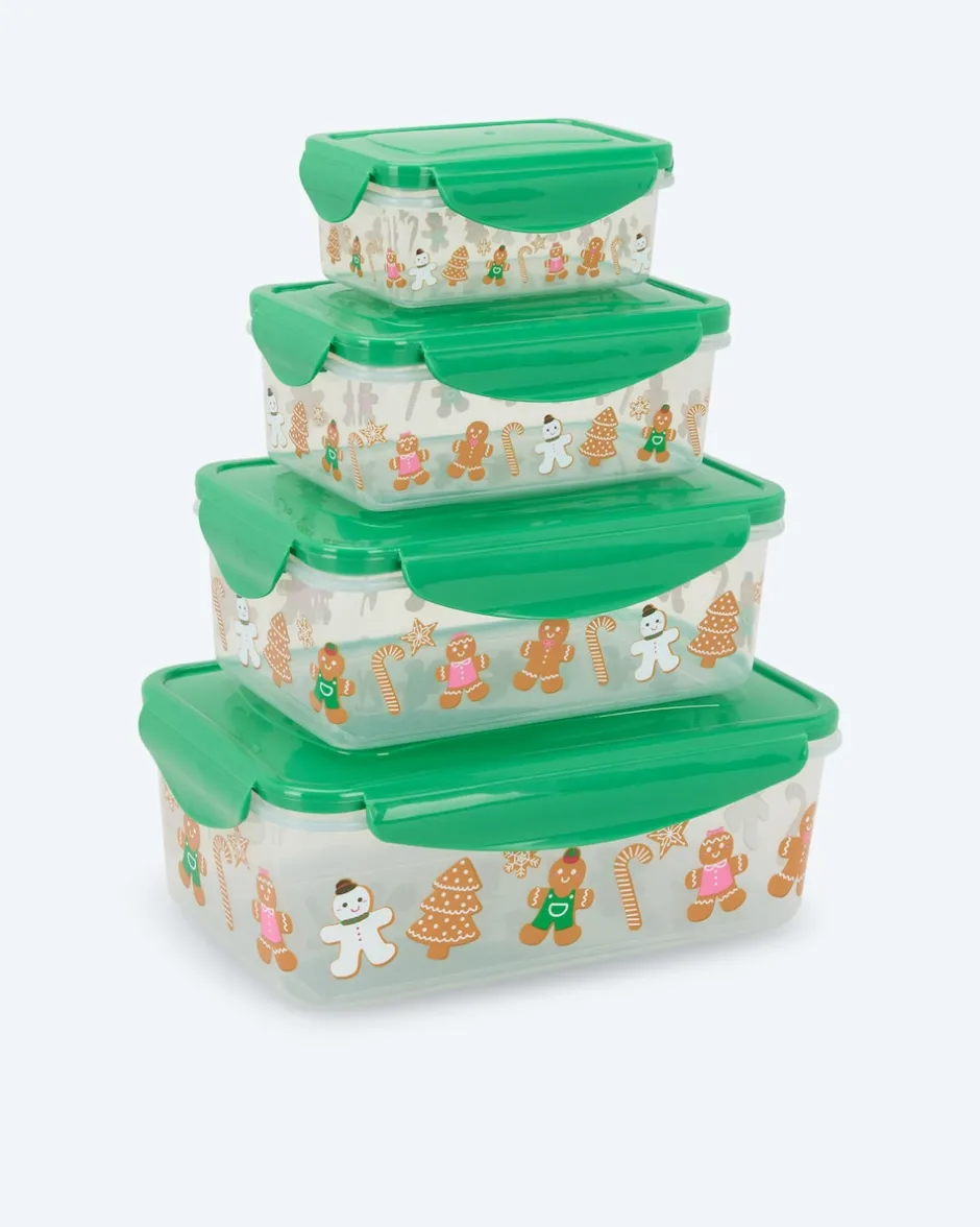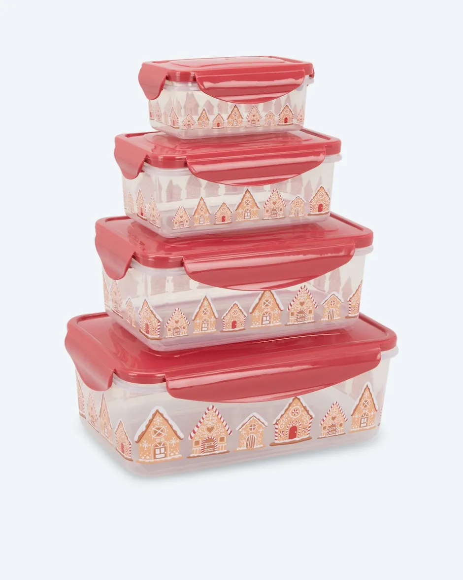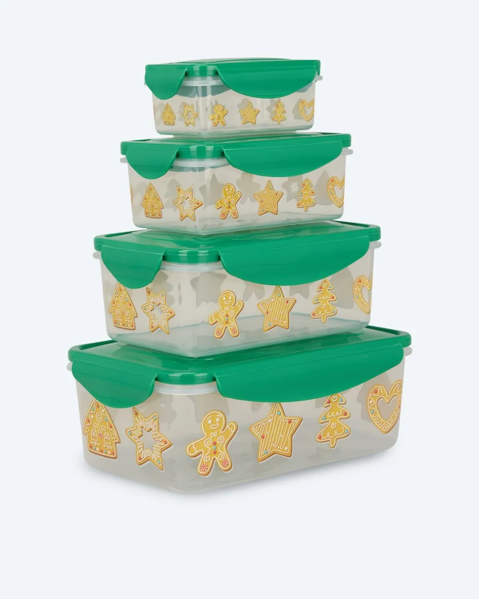Von Cucinella erhalten Sie ein Set mit Frischhalteboxen in 4 verschiedenen Größen. Darin sind Aufschnitt, Müsli, Snacks oder die Reste Ihres Mittagessens immer gut und frisch aufgehoben. Jede Dose hat einen perfekt sitzenden, 4-fachen Klickverschluss für ein lang anhaltend intensives Aroma. Der Verschluss mit Silikondichtung verhindert außerdem das Eindringen von Luft und Wasser. Dadurch bleiben Lebensmittel länger frisch. Das Austreten von unangenehmen Aromen bei geruchsintensiven Speisen wird ebenfalls verhindert. Sie erhalten die Cucinella Boxen passend zur Jahreszeit jetzt mit fröhlichen Weihnachtsmotiven.