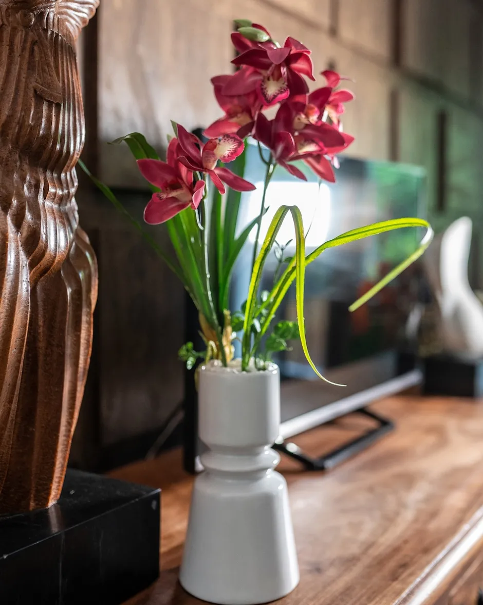 | Lieferumfang: | 1x Kahnorchideen-Arrangement in Vase (Kunstpflanze) | |