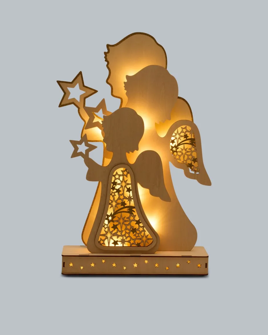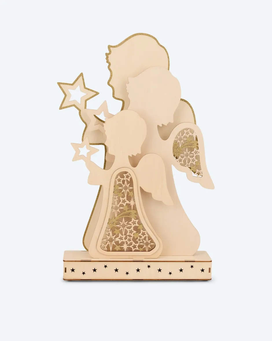 Ein Engel kommt selten allein – so auch hier: Die zauberhafte Deko besteht aus drei hintereinander stehenden Engeln in unterschiedlichen Designs. So ergibt sich ein raffinierter 3D-Effekt, zudem sind die Engel partiell mit biologisch abbaubarem Glitter verziert. Das himmlische Trio ist auf einer Holzbasis miteinander verbunden. Dank integrierter warmweißer LEDs sorgen die Engelchen für eine festliche Atmosphäre in Ihren Wohnräumen und stimmen die ganze Familie auf den Winter und auf Weihnachten ein.