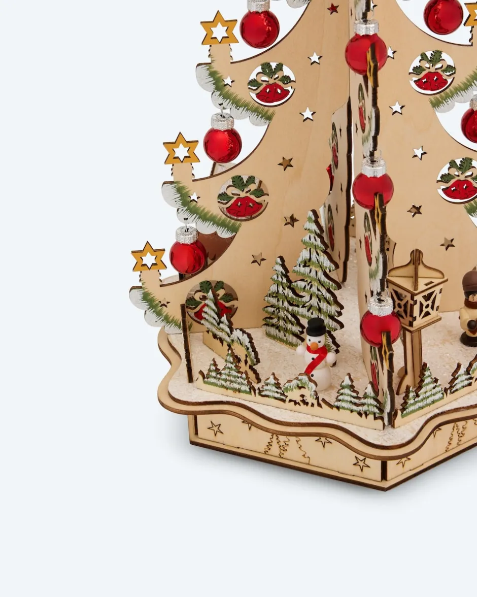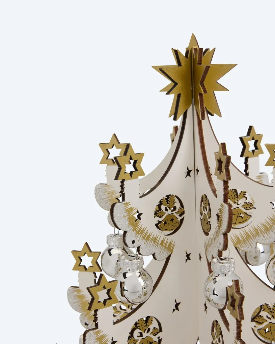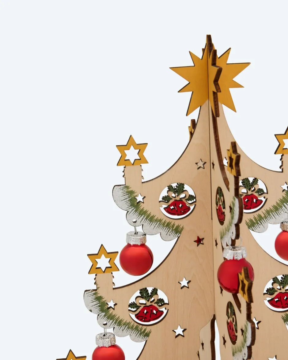 Das Deko-Ensemble in 3D-Weihnachtsbaum-Form zum Aufstellen steht auf einem sechseckigen Sockel und ist teilweise mit biologisch abbaubarem Glitzer verziert. So schaffen Sie mit wenigen Handgriffen eine behagliche Festtags-Stimmung in Ihrem Zuhause.