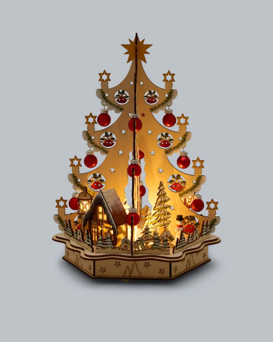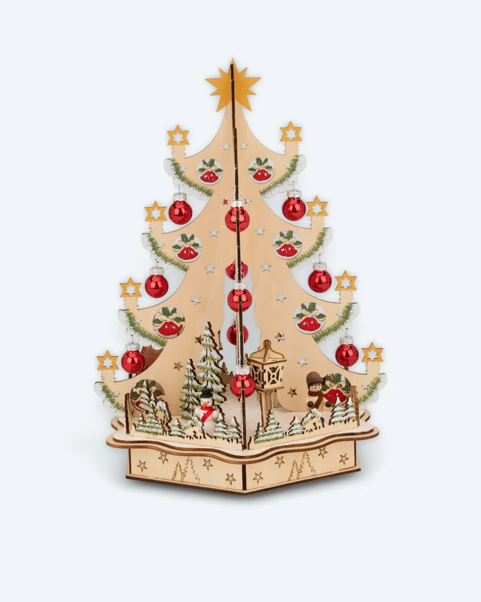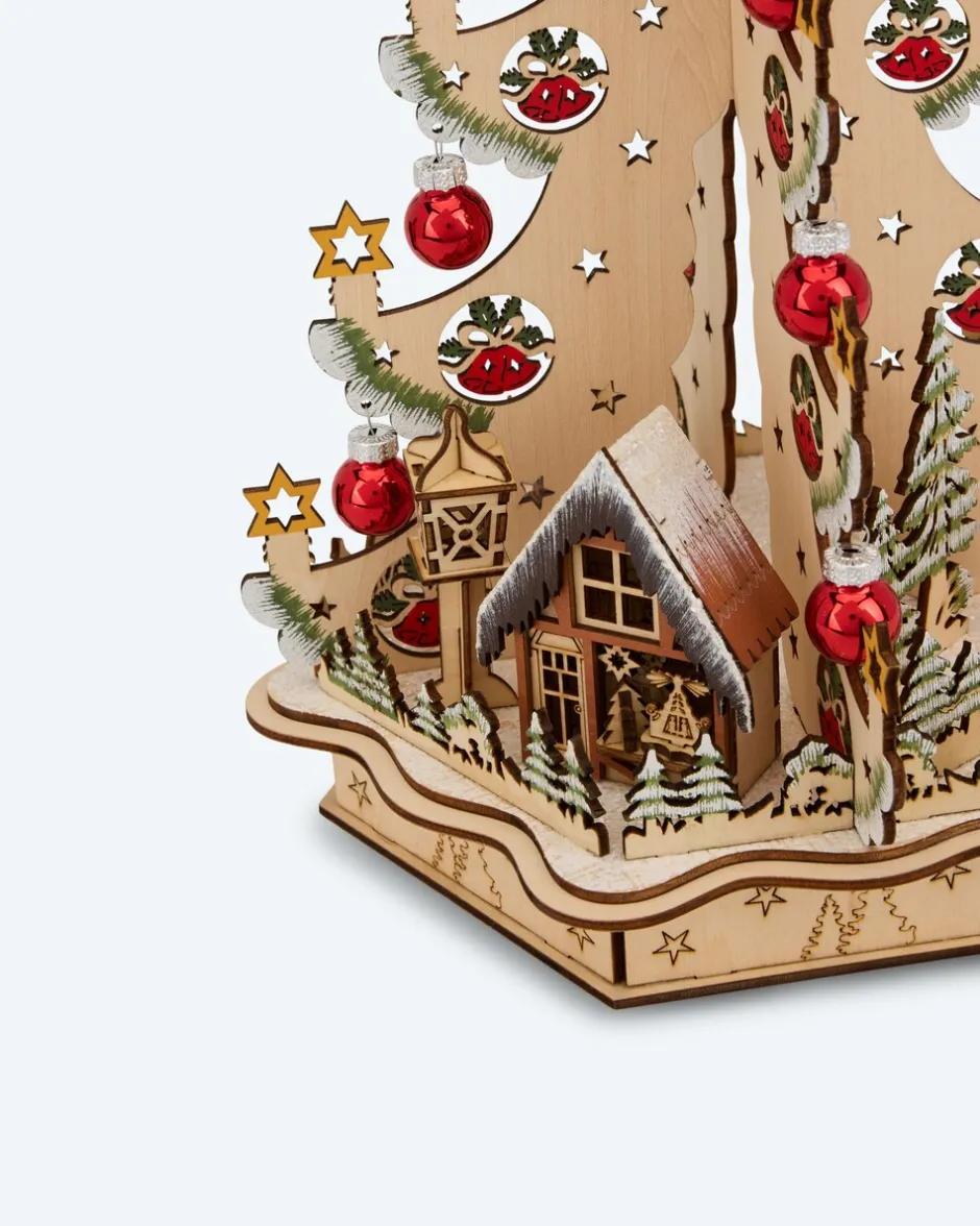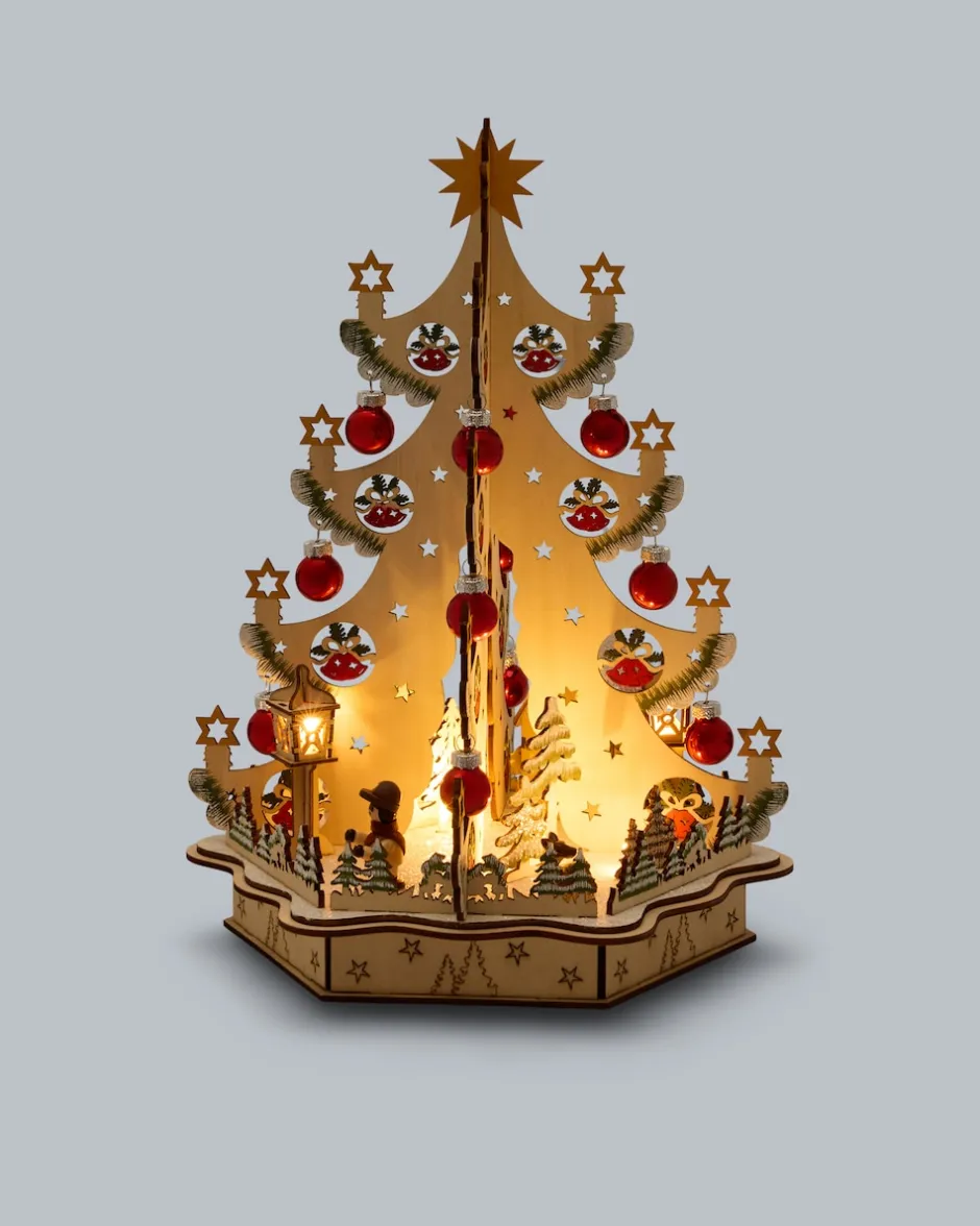 Das Deko-Ensemble in 3D-Weihnachtsbaum-Form zum Aufstellen steht auf einem sechseckigen Sockel und ist teilweise mit biologisch abbaubarem Glitzer verziert. So schaffen Sie mit wenigen Handgriffen eine behagliche Festtags-Stimmung in Ihrem Zuhause.