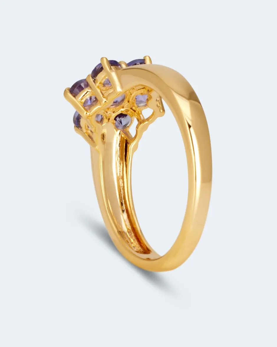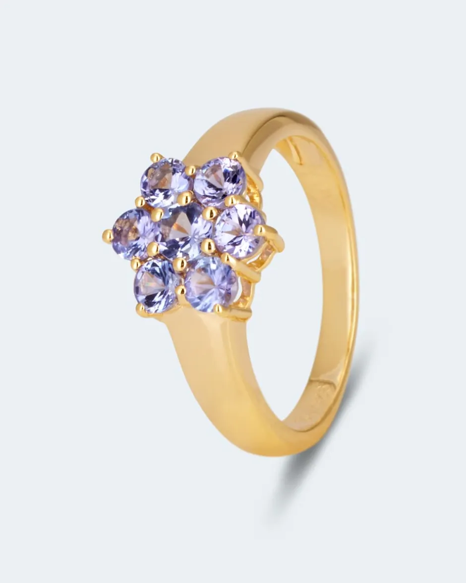 Erleben Sie die Faszination dieses charmanten Rings, der durch sein florales Design und die exquisite Farbe der Edelsteine bezaubert. Gefertigt aus hochglanzpoliertem 925er Sterlingsilber und gelbvergoldet, strahlt dieser Ring pure Eleganz aus. 7 rund facettierte Tansanite in AA+ Farbqualität bilden ein kunstvolles Blumen-Arrangement, das jedem Styling einen Hauch von Frische verleiht. Alle Steine sind sicher in Krappenfassungen gefasst und wiegen zusammen etwa 3,18 Karat. Mit unserem Ring bringen Sie einen Hauch von Schönheit und stilvoller Eleganz in Ihre Schmucksammlung.