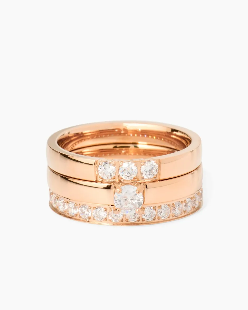 Sie erhalten drei Ringe aus hochglanzpoliertem Nichtedelmetall in verschiedenen Designs. Alle drei sind mit weißen Zirkonia verziert, die dank des Brillantschliffs herrlich glitzern. Zwei der Ringe sind im Bandringdesign gestaltet, einer mit einem einzelnen großen Zirkonia auf dem Ringkopf. Außerdem haben Sie die Wahl, ob Sie Ihren neuen Ring in Gelbgold-, Silber- oder Roségold-Optik wünschen. Freuen Sie sich auf hinreißende Schmuck-Accessoire für jeden Tag.
