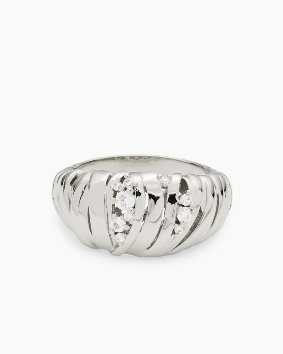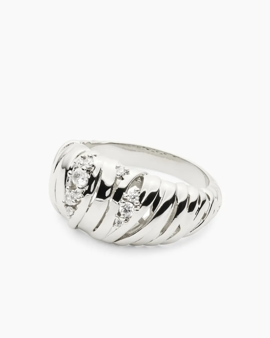 Ein wunderschöner Ring aus hochglanzpoliertem Messing. Bestellbar in der gelbvergoldeten Variante mit warmem Goldschimmer oder palladiniert in kühl-eleganter Platinoptik. Der Ring mit zarter Ringschiene wird zum Ringkopf hin immer breiter. Der Ringkopf ist mit zehn weißen Zirkonia in verschiedenen Größen ausgefasst. Die runden Zirkonia sind außerdem im Facettenschliff veredelt und glitzern bei jeder Ihrer Bewegungen zauberhaft. Schicker Schmuck mit Charme muss nicht teuer sein.