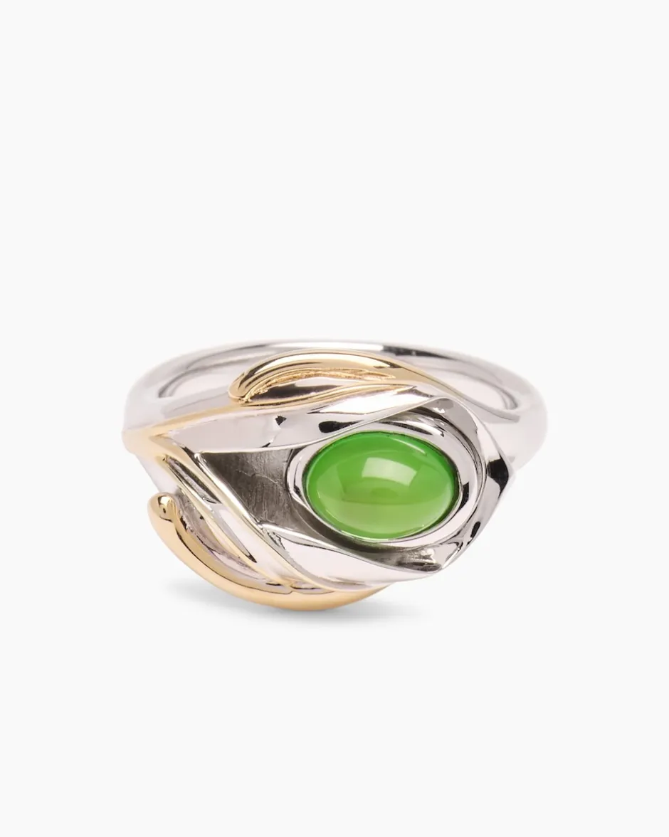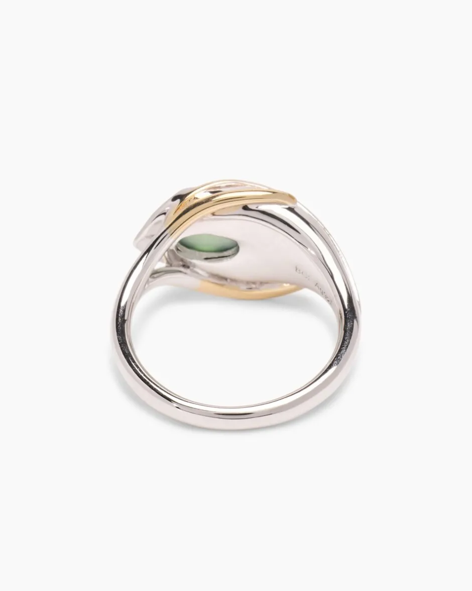 Ein seltener Edelstein-Hybrid macht diesen Ring zu einem absoluten Glanzstück in jeder Schmucksammlung: Die große, ovale Bernstein-Perlmutt-Dublette mittig auf dem Ringkopf ist sorgfältig im Cabochon veredelt, so kann sie ihre unnachahmliche Präsenz optimal entfalten. Gehalten wird die Dublette von einer dezenten Zargenfassung, die eine großzügige Lichtausbeute erlaubt. Bemerkenswert ist auch das moderne Ringdesign aus bestem Sterlingsilber 925 mit silberweiß rhodinierten und gelbgoldplattierten Elementen. Das einzigartige Schmuckstück in kleiner Auflage kommt mit einem Silbermaster-Zertifikat zu Ihnen.