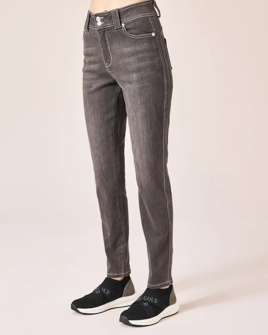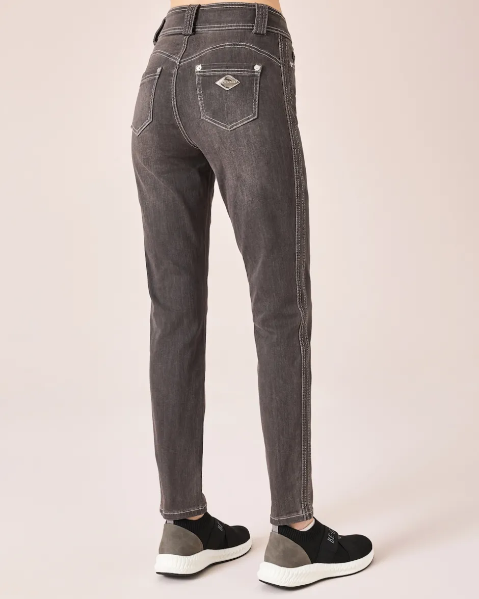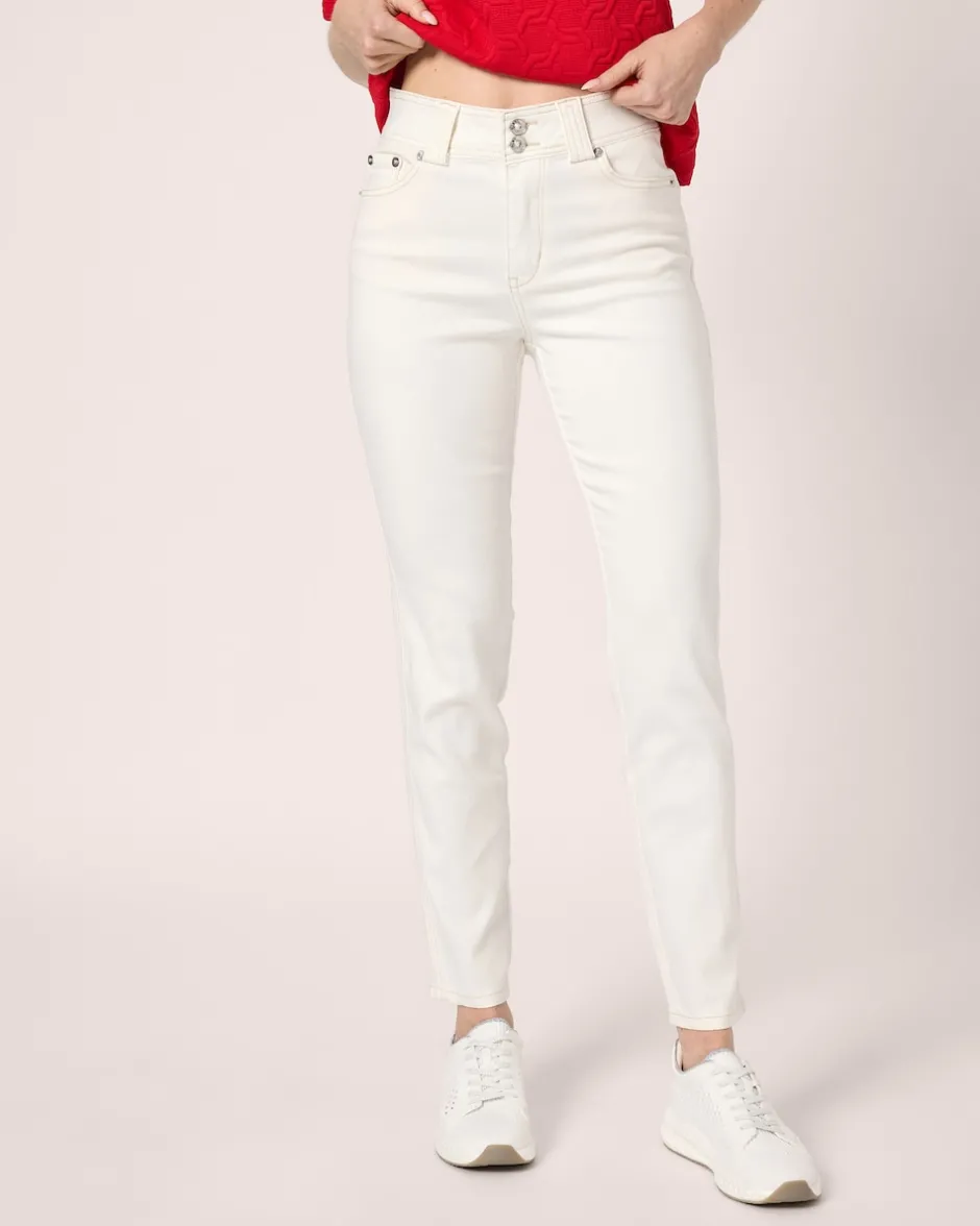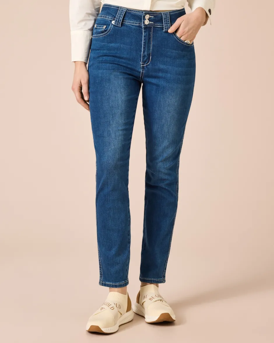 Die Superflex Denim ist schmal geschnitten und im 5-Pocket-Stil designt. Freuen Sie sich auf perfekten Sitz, optimale Passform, lange, schlanke Beine und einen schönen Po. Der breite Bund auf Nabelhöhe mit Gürtelschlaufen sorgt für einen flachen Bauch und die Metallapplikation auf der Gesäßtasche ist ein raffinierter kleiner Blickfang. Verschlossen wird Ihre neue Lieblingjeans mit einem steinbesetzten Knopf und einem Reißverschluss. Das herrlich bequeme Material garantiert besten Tragekomfort. Die Denim ist in vielen Farben bestellbar und passt zu allem. Ob in der Freizeit oder im Büro – Sie geben eine super Figur ab.
