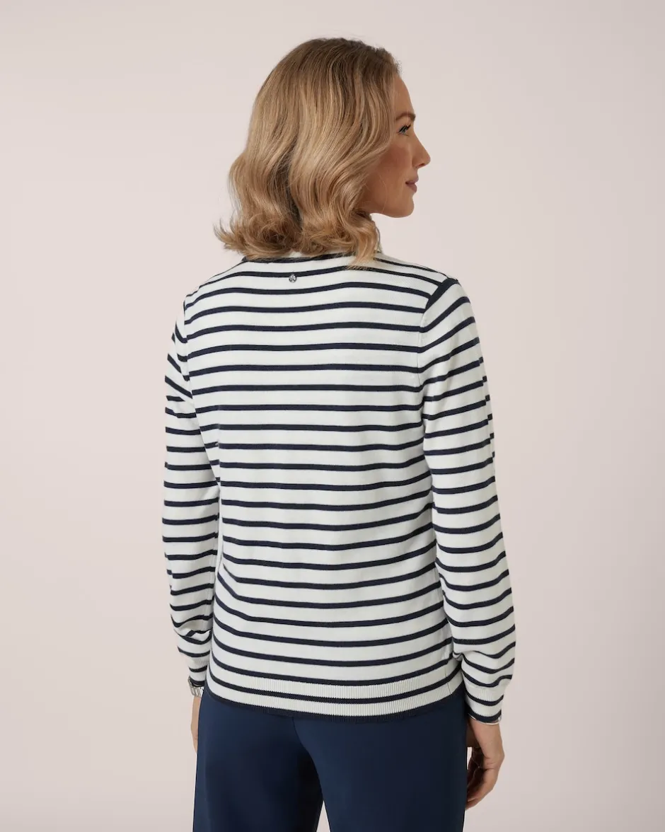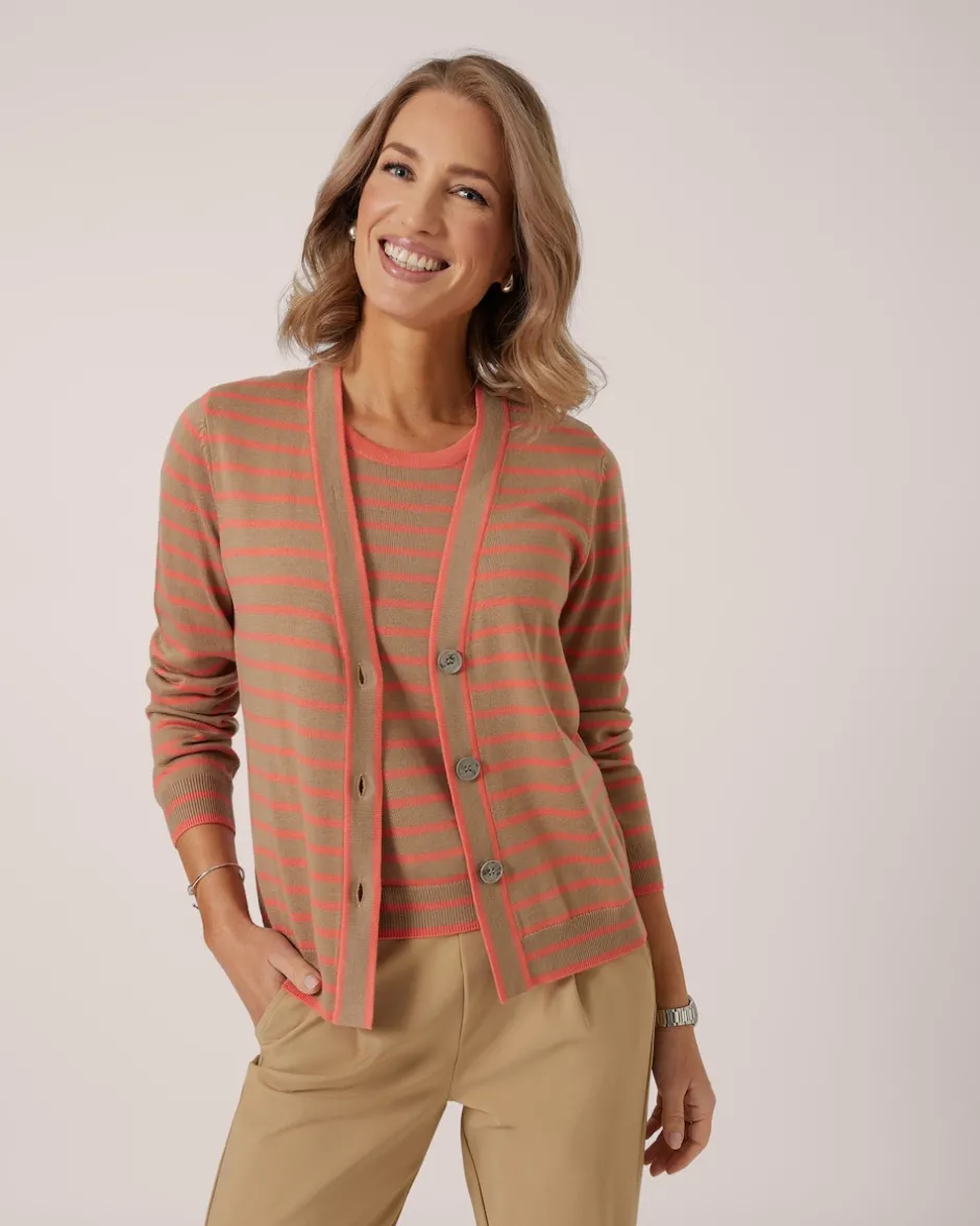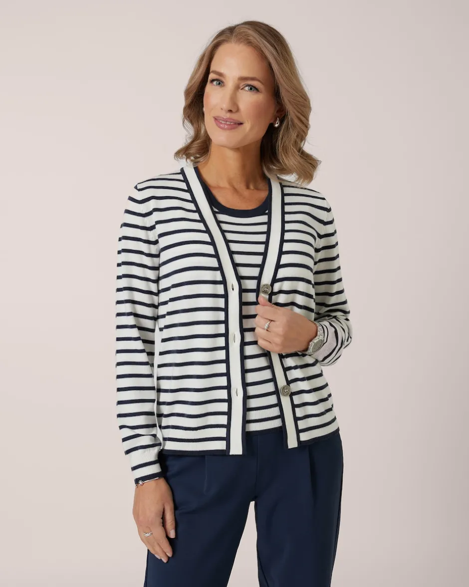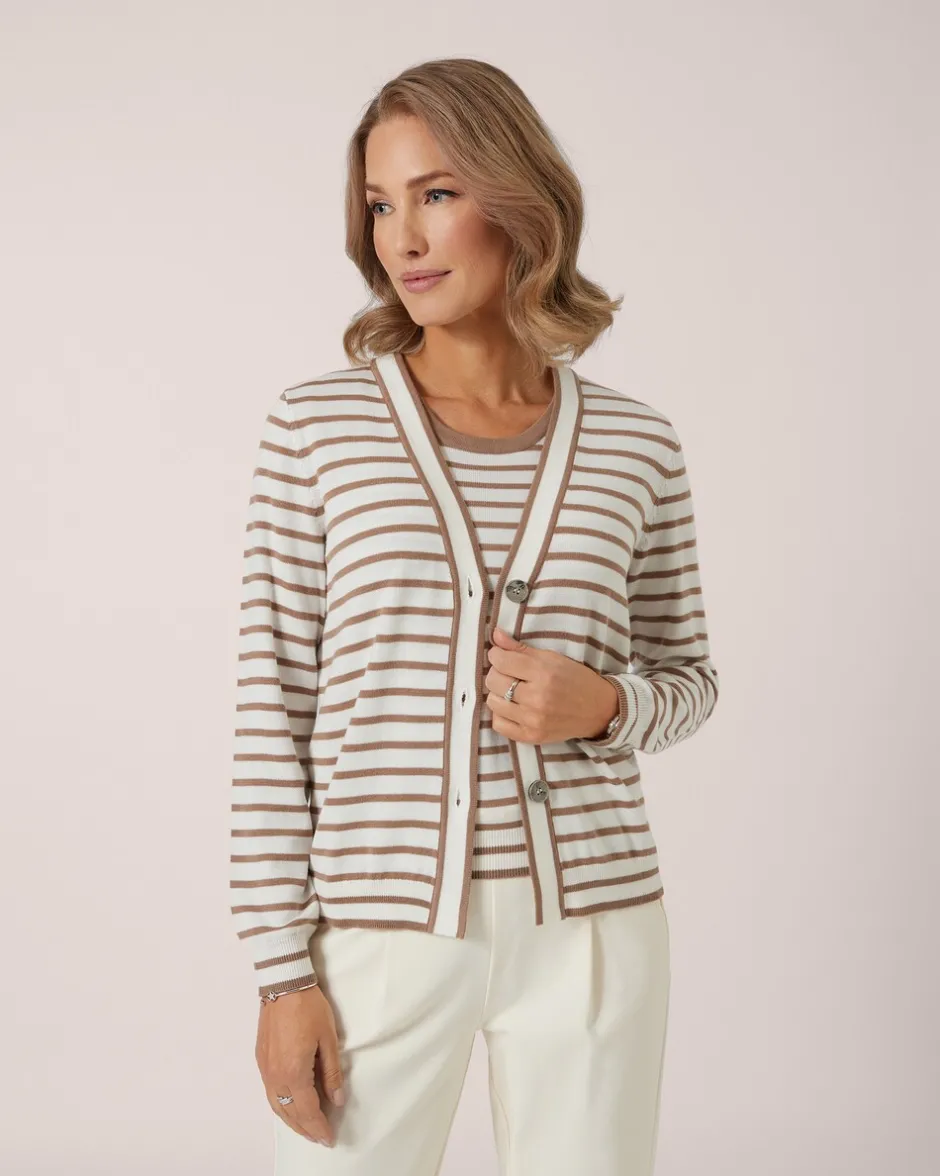 Passt immer: Ein Twinset bringt femininen Chic in jeden Look. Das Duo von THOM by Thomas Rath besteht aus einem ärmellosen Top und einem Cardigan mit Knopfleiste. Beide Teile sind im Streifen-Design gearbeitet und lassen sich in Kombination tragen oder solo kombinieren. Beide Teile sind aus weichem Strick mit Viskose- und Kaschmir-Anteil gefertigt und liegen weich auf der Haut. Eine Bereicherung Ihrer Garderobe.