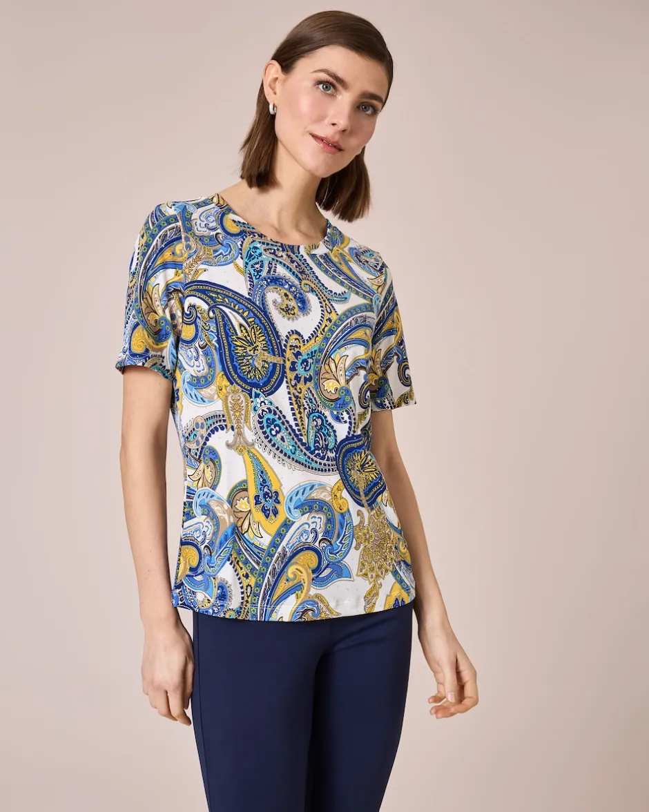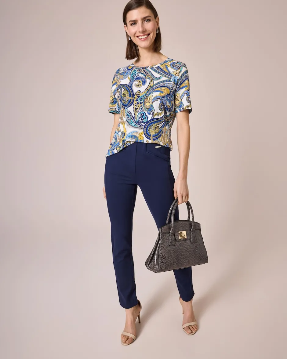 Ein immer aktueller Paisley-Print in harmonischen Farben macht dieses Alfredo Pauly Shirt zu einem Gute-Laune-Piece, das Sie immer wieder gerne anziehen werden. Haupt-Blickfang ist das Paisley-Muster im Stil der 70er Jahre. Die Alltagsmode ist leicht tailliert geschnitten mit Rundhals und Kurzarm. Zu Ihrem neuen Designerliebling in leuchtenden Farben kombinieren Sie am besten eine unifarbene Hose – schon steht Ihr Trend-Outfit für Job oder Freizeit.