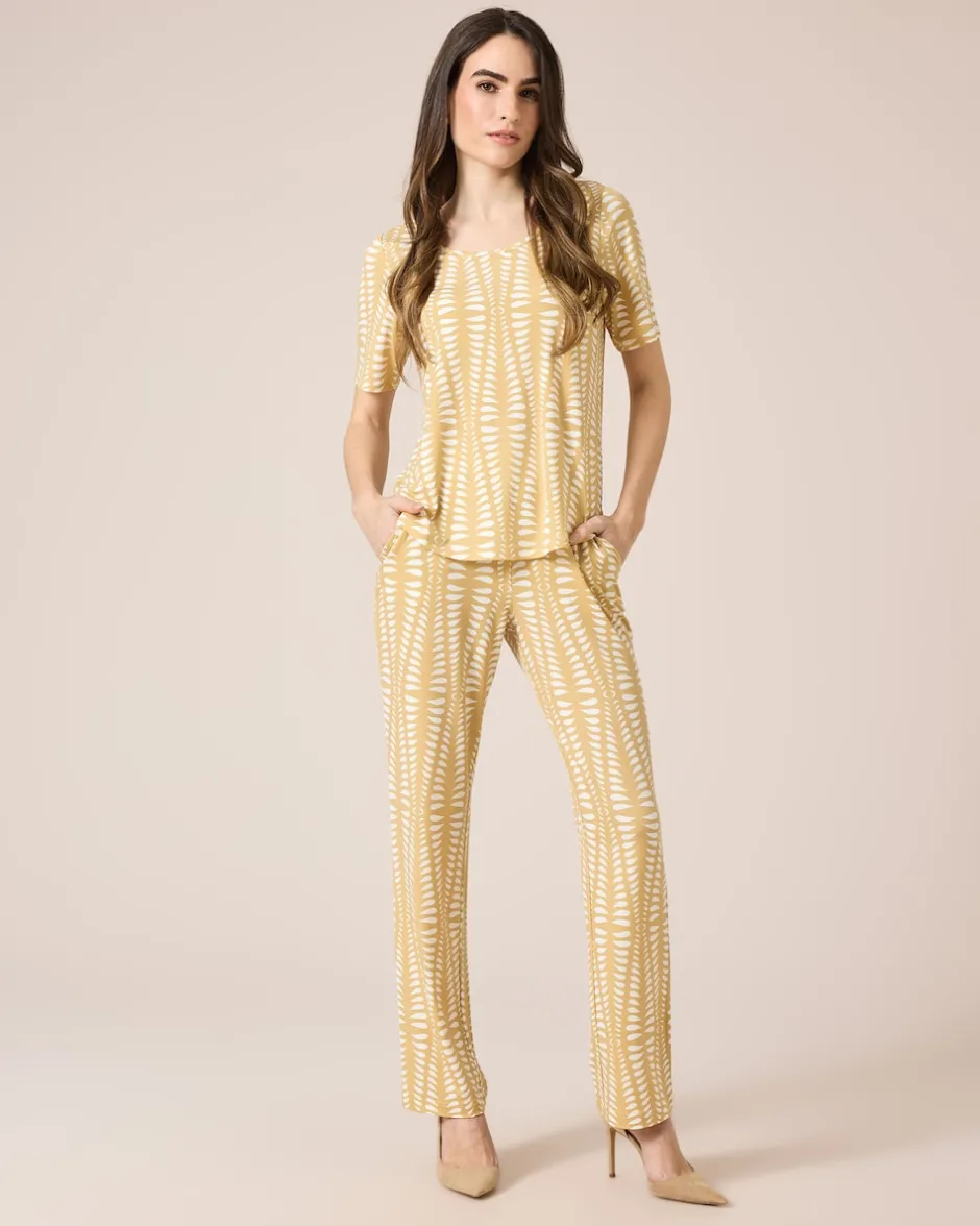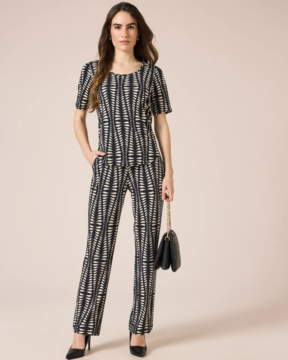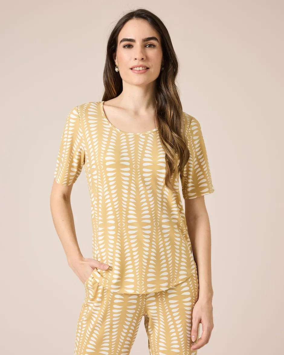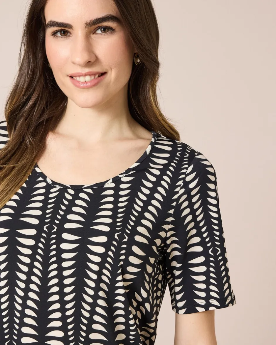 Unser Shirt im 2-Farb-Design ist ein trendstarkes, modisches Statement. Der grafische Allover-Druck bietet eine visuelle Lebendigkeit, die das Auge erfreut und gleichzeitig einen künstlerischen Touch verleiht. Mit seinem weiten Rundhalsausschnitt und halblangen Ärmeln bietet es eine bequeme Passform, während der abgerundete Saum den Look mit einer subtilen Eleganz vervollständigt. Kombinieren Sie dieses vielseitige Shirt mit einer Jeans für einen lässigen Alltagslook oder mit einer schicken Hose für einen Abendausflug. Egal ob beim Shoppingtrip in der Stadt oder bei einem entspannten Kaffee-Treff mit Freunden, dieses Shirt passt zu jedem Anlass.